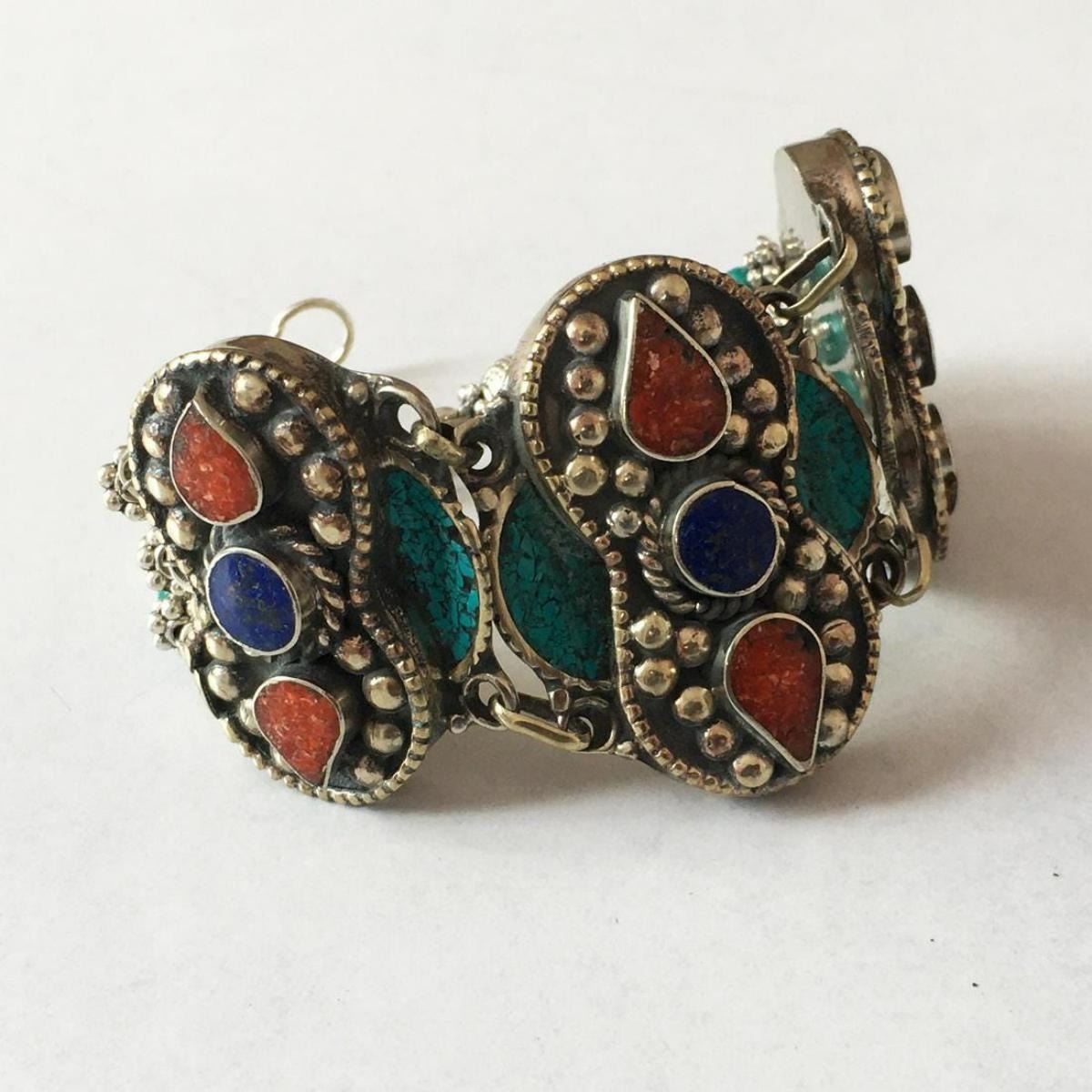 Tibet Natural Stone Hand Made lapiz lazuli Bracelet.......This elegant large Bracelet was handcrafted in Tibet, the home of exquisite jewelry craftsmanship. It was skillfully made with natural Lapiz Lazuli, each in a deep Tibetan Silver setting. and balance the design perfectly. Turquoise is used virtually worldwide for jewelry making, and is highly prized for its brilliant colors, which vary from mine to mine. The distinctive webbing patterns and variations of color in the stones .”””Note- All stones in this Bracelet are Natural.....Guaranteed....Vintage look but Bracelet is brand new.
