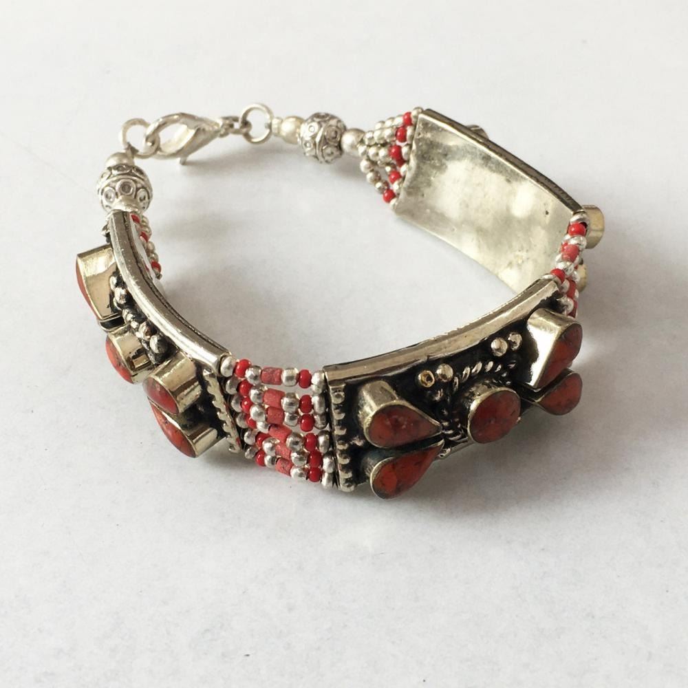 Tibet Hand Made natural coral stone Bracelet.......This elegant large Bracelet was handcrafted in Tibet, the home of exquisite jewelry craftsmanship. It was skillfully made with natural local natural stone, each in a deep Tibetan Silver setting. and balance the design perfectly. Turquoise is used virtually worldwide for jewelry making, and is highly prized for its brilliant colors, which vary from mine to mine. The distinctive webbing patterns and variations of color in the stones .....Vintage look but Bracelet is brand new