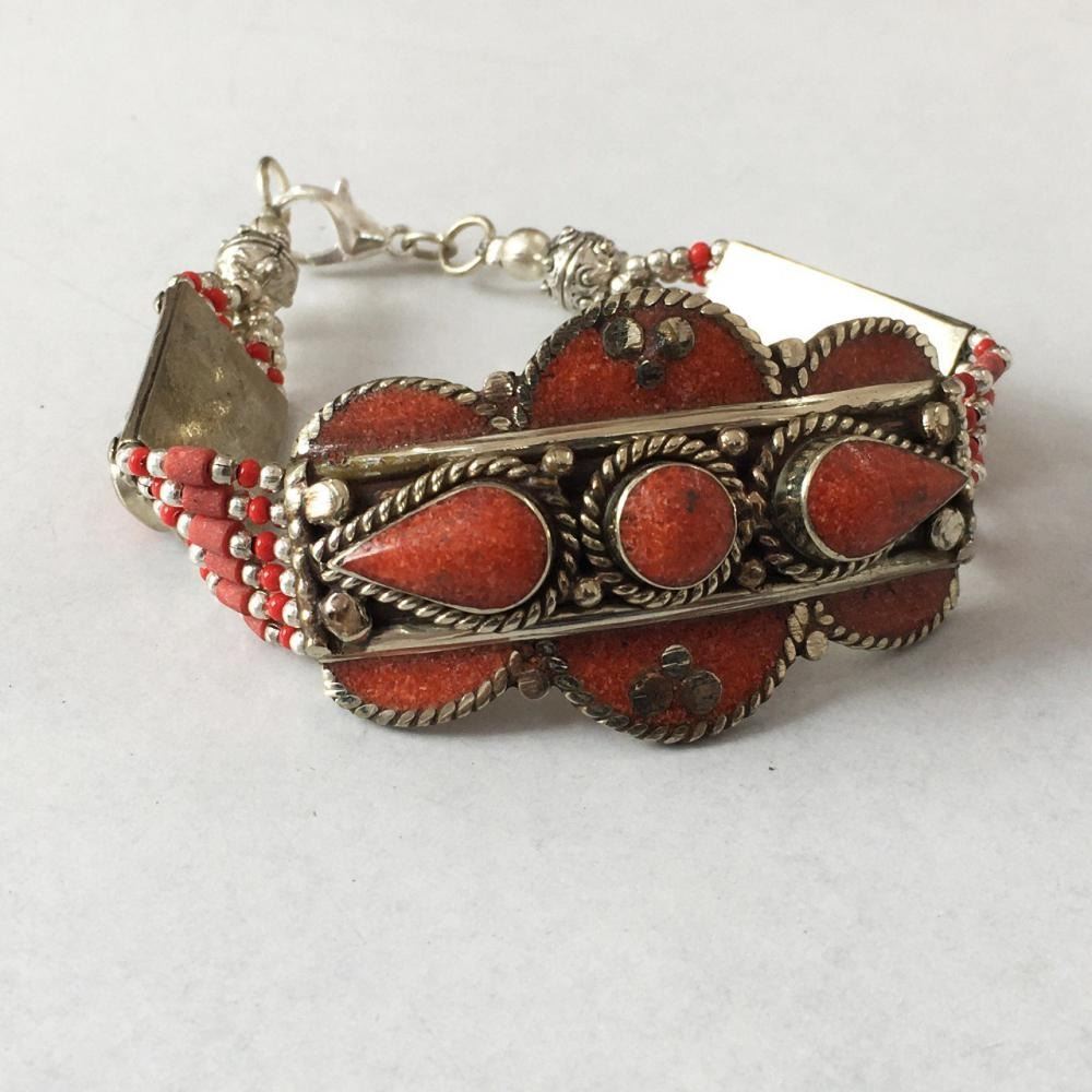 Tibet Hand Made natural coral stone Bracelet.......This elegant large Bracelet was handcrafted in Tibet, the home of exquisite jewelry craftsmanship. It was skillfully made with natural local natural stone, each in a deep Tibetan Silver setting. and balance the design perfectly. Turquoise is used virtually worldwide for jewelry making, and is highly prized for its brilliant colors, which vary from mine to mine. The distinctive webbing patterns and variations of color in the stones .....Vintage look but Bracelet is brand new