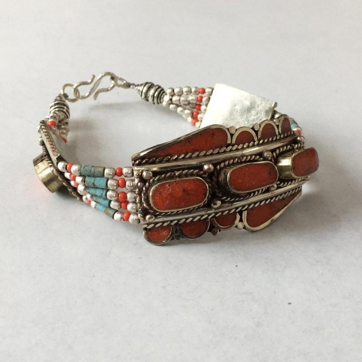Tibet Hand Made natural coral stone Bracelet.......This elegant large Bracelet was handcrafted in Tibet, the home of exquisite jewelry craftsmanship. It was skillfully made with natural local natural stone, each in a deep Tibetan Silver setting. and balance the design perfectly. Turquoise is used virtually worldwide for jewelry making, and is highly prized for its brilliant colors, which vary from mine to mine. The distinctive webbing patterns and variations of color in the stones .....Vintage look but Bracelet is brand new