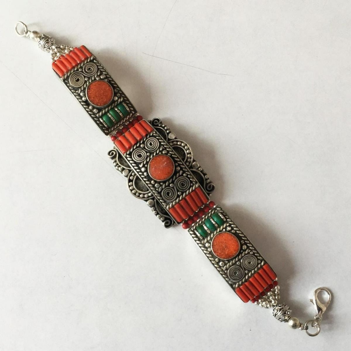 Tibet Natural Stone Hand Made natural stone Bracelet.......This elegant large Bracelet was handcrafted in Tibet, the home of exquisite jewelry craftsmanship. It was skillfully made with natural local natural stone, each in a deep Tibetan Silver setting. and balance the design perfectly. Turquoise is used virtually worldwide for jewelry making, and is highly prized for its brilliant colors, which vary from mine to mine. The distinctive webbing patterns and variations of color in the stones .”””Note- All stones in this Bracelet are Natural.....Guaranteed....Vintage look but Bracelet is brand new