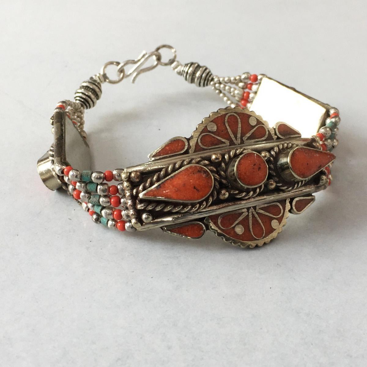 Tibet Natural Stone Hand Made natural stone Bracelet.......This elegant large Bracelet was handcrafted in Tibet, the home of exquisite jewelry craftsmanship. It was skillfully made with natural local natural stone, each in a deep Tibetan Silver setting. and balance the design perfectly. Turquoise is used virtually worldwide for jewelry making, and is highly prized for its brilliant colors, which vary from mine to mine. The distinctive webbing patterns and variations of color in the stones .”””Note- All stones in this Bracelet are Natural.....Guaranteed....Vintage look but Bracelet is brand new