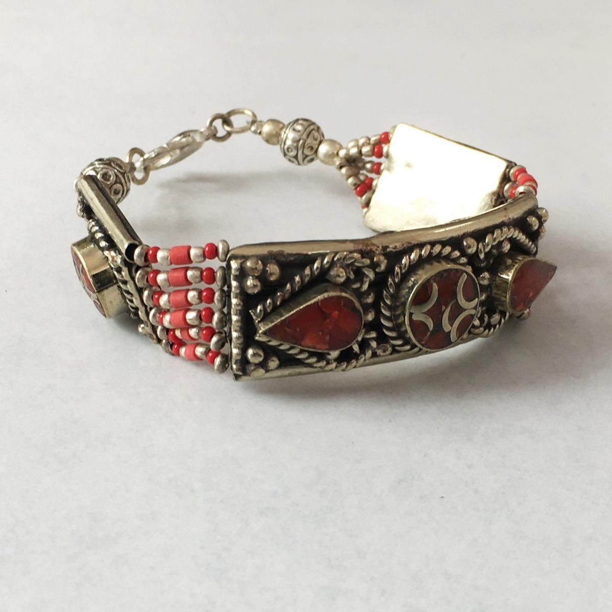 Tibet Natural Stone Hand Made natural stone Bracelet.......This elegant large Bracelet was handcrafted in Tibet, the home of exquisite jewelry craftsmanship. It was skillfully made with natural local natural stone, each in a deep Tibetan Silver setting. and balance the design perfectly. Turquoise is used virtually worldwide for jewelry making, and is highly prized for its brilliant colors, which vary from mine to mine. The distinctive webbing patterns and variations of color in the stones .”””Note- All stones in this Bracelet are Natural.....Guaranteed....Vintage look but Bracelet is brand new