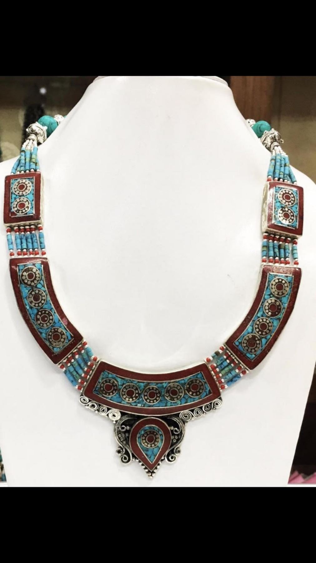 Tibet Natural Stone Hand Made Turquoise, Coral Necklace......;This elegant large Necklace was handcrafted in Tibet, the home of exquisite jewelry craftsmanship. It was skillfully made with large natural Turquoise, each in a deep Tibetan Silver setting. and balance the design perfectly. Turquoise is used virtually worldwide for jewelry making, and is highly prized for its brilliant colors, which vary from mine to mine. The distinctive webbing patterns and variations of color in the stones on this wonderful piece are typical of the natural Turquoise found throughout much of the Himalayan region, where Turquoise has been used in jewelry-making since centuries.