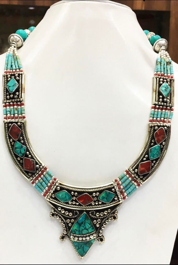 Tibet Natural Stone Hand Made Turquoise, Coral Necklace......;This elegant large Necklace was handcrafted in Tibet, the home of exquisite jewelry craftsmanship. It was skillfully made with large natural Turquoise, each in a deep Tibetan Silver setting. and balance the design perfectly. Turquoise is used virtually worldwide for jewelry making, and is highly prized for its brilliant colors, which vary from mine to mine. The distinctive webbing patterns and variations of color in the stones on this wonderful piece are typical of the natural Turquoise found throughout much of the Himalayan region, where Turquoise has been used in jewelry-making since centuries.”””Note- All stones in this necklace are Natural.....Guaranteed....Vintage look but necklace is brand new.