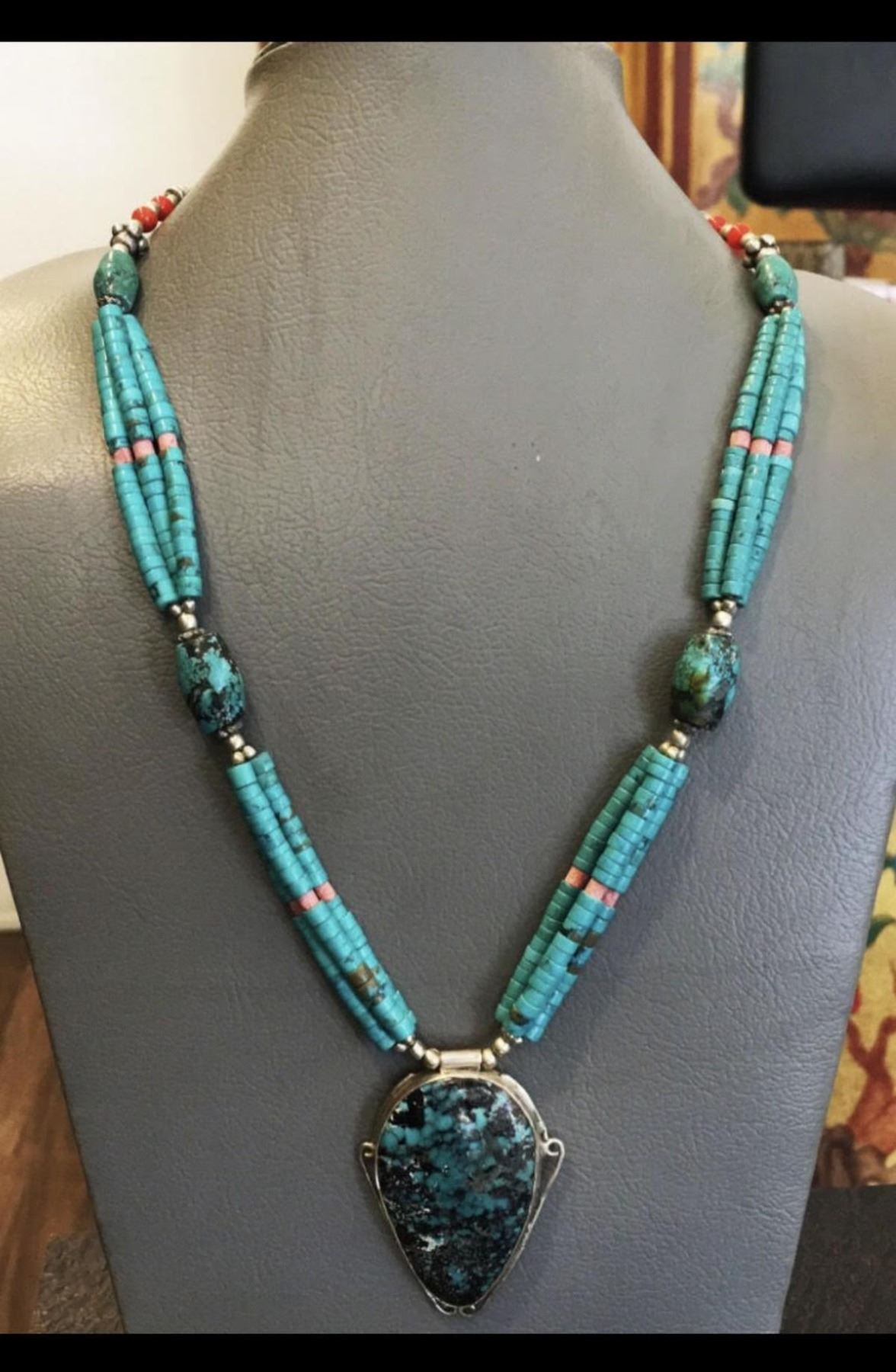 Tibet Natural Stone Hand Made Turquoise, Coral Necklace......;This elegant large Necklace was handcrafted in Tibet, the home of exquisite jewelry craftsmanship. It was skillfully made with large natural Turquoise, each in a deep Tibetan Silver setting. and balance the design perfectly. Turquoise is used virtually worldwide for jewelry making, and is highly prized for its brilliant colors, which vary from mine to mine. The distinctive webbing patterns and variations of color in the stones on this wonderful piece are typical of the natural Turquoise found throughout much of the Himalayan region, where Turquoise has been used in jewelry-making since centuries.”””Note- All stones in this necklace are Natural.....Guranteed....Vintage look but necklace is brand new.