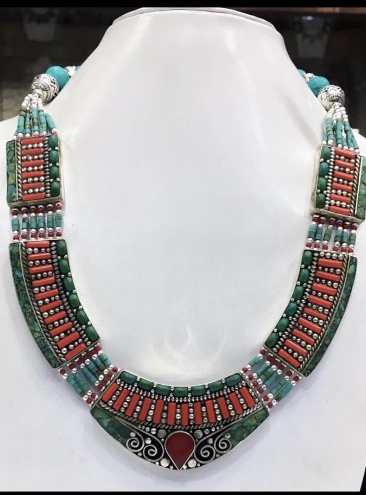 Tibet Natural Stone Hand Made Turquoise, Coral Necklace......;This elegant large Necklace was handcrafted in Tibet, the home of exquisite jewelry craftsmanship. It was skillfully made with large natural Turquoise, each in a deep Tibetan Silver setting. and balance the design perfectly. Turquoise is used virtually worldwide for jewelry making, and is highly prized for its brilliant colors, which vary from mine to mine. The distinctive webbing patterns and variations of color in the stones on this wonderful piece are typical of the natural Turquoise found throughout much of the Himalayan region, where Turquoise has been used in jewelry-making since centuries.”””Note- All stones in this necklace are Natural.....Guaranteed....Vintage look but necklace is brand new.