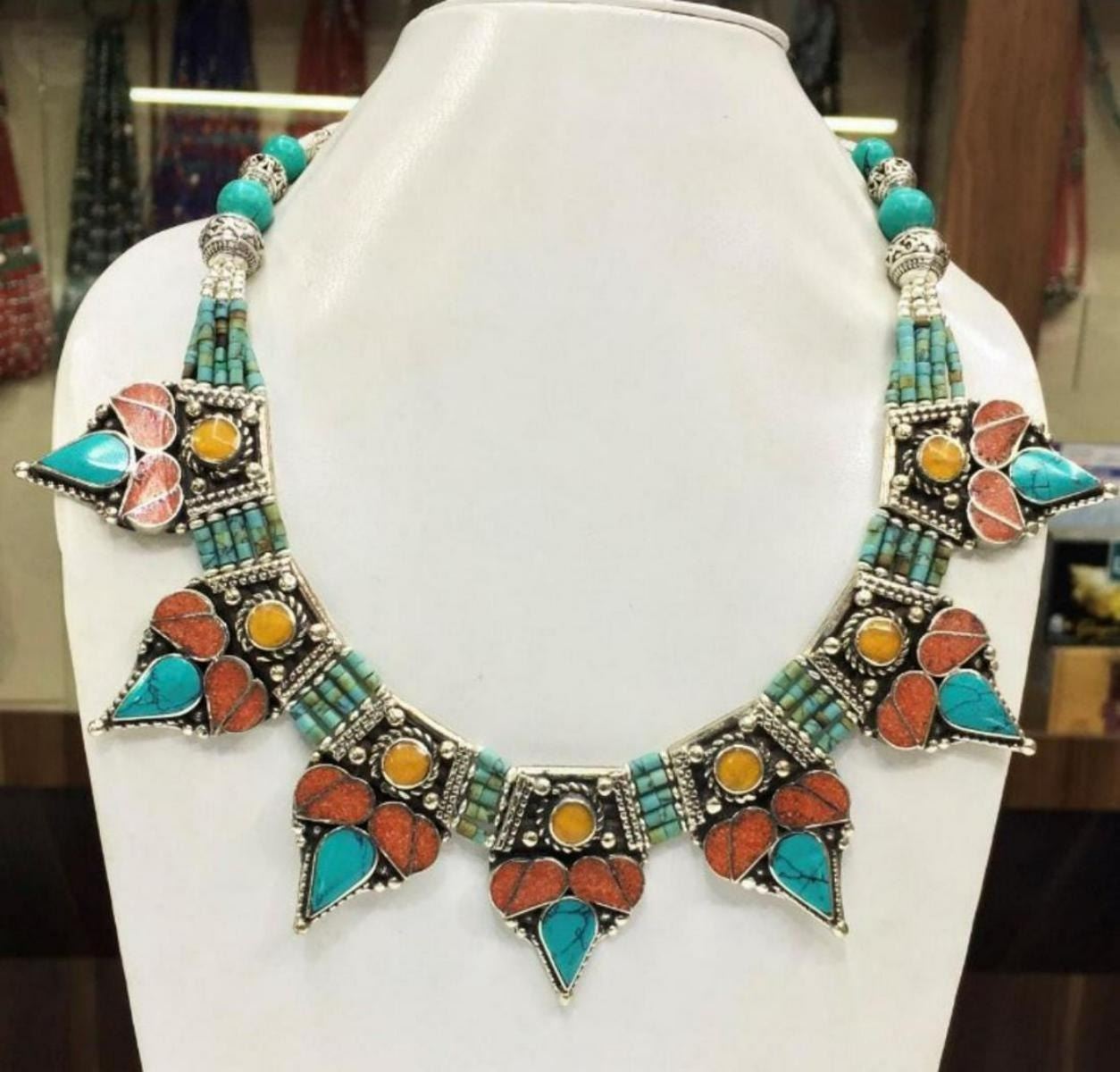 Tibet Natural Stone Hand Made Turquoise, Coral Necklace......;This elegant large Necklace was handcrafted in Tibet, the home of exquisite jewelry craftsmanship. It was skillfully made with large natural Turquoise, each in a deep Tibetan Silver setting. and balance the design perfectly. Turquoise is used virtually worldwide for jewelry making, and is highly prized for its brilliant colors, which vary from mine to mine. The distinctive webbing patterns and variations of color in the stones on this wonderful piece are typical of the natural Turquoise found throughout much of the Himalayan region, where Turquoise has been used in jewelry-making since centuries.”””Note- All stones in this necklace are Natural.....Guaranteed....Vintage look but necklace is brand new.