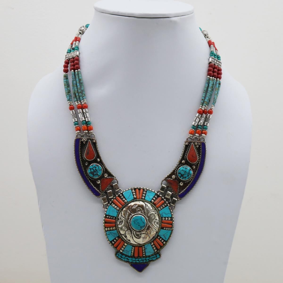 Tibet Natural Stone Hand Made Turquoise, Coral Necklace......;This elegant large Necklace was handcrafted in Tibet, the home of exquisite jewelry craftsmanship. It was skillfully made with large natural Turquoise, each in a deep Tibetan Silver setting. and balance the design perfectly. Turquoise is used virtually worldwide for jewelry making, and is highly prized for its brilliant colors, which vary from mine to mine. The distinctive webbing patterns and variations of color in the stones on this wonderful piece are typical of the natural Turquoise found throughout much of the Himalayan region, where Turquoise has been used in jewelry-making since centuries.