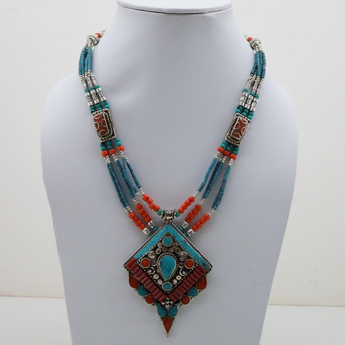 Tibet Natural Stone Hand Made Turquoise, Coral Necklace......;This elegant large Necklace was handcrafted in Tibet, the home of exquisite jewelry craftsmanship. It was skillfully made with large natural Turquoise, each in a deep Tibetan Silver setting. and balance the design perfectly. Turquoise is used virtually worldwide for jewelry making, and is highly prized for its brilliant colors, which vary from mine to mine. The distinctive webbing patterns and variations of color in the stones on this wonderful piece are typical of the natural Turquoise found throughout much of the Himalayan region, where Turquoise has been used in jewelry-making since centuries.