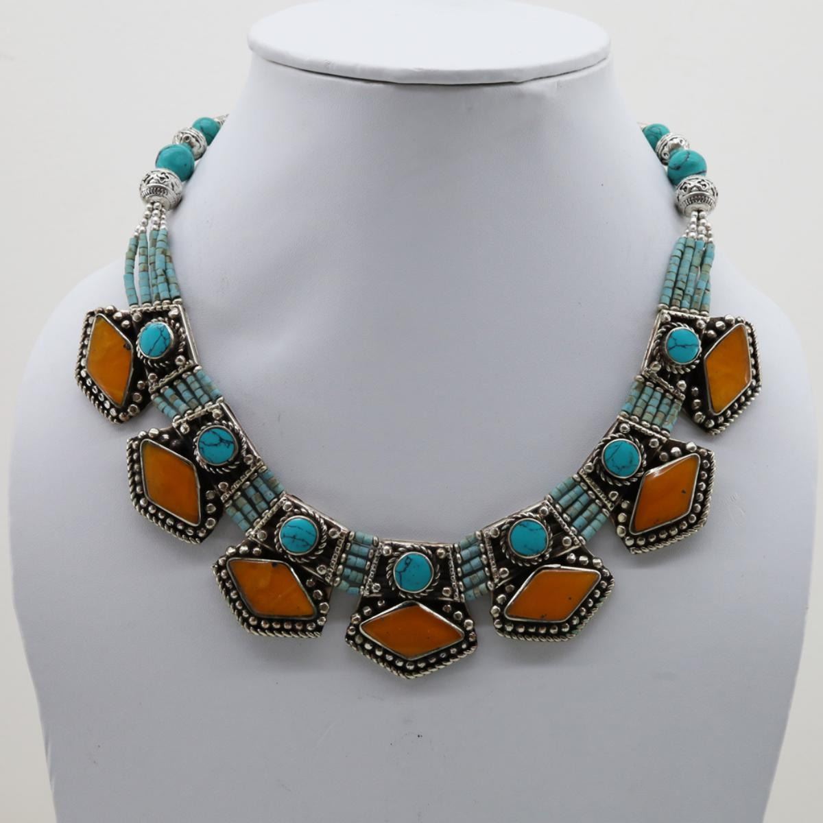 Tibet Natural Stone Hand Made Turquoise, Coral Necklace......;This elegant large Necklace was handcrafted in Tibet, the home of exquisite jewelry craftsmanship. It was skillfully made with large natural Turquoise, each in a deep Tibetan Silver setting. and balance the design perfectly. Turquoise is used virtually worldwide for jewelry making, and is highly prized for its brilliant colors, which vary from mine to mine. The distinctive webbing patterns and variations of color in the stones on this wonderful piece are typical of the natural Turquoise found throughout much of the Himalayan region, where Turquoise has been used in jewelry-making since centuries.