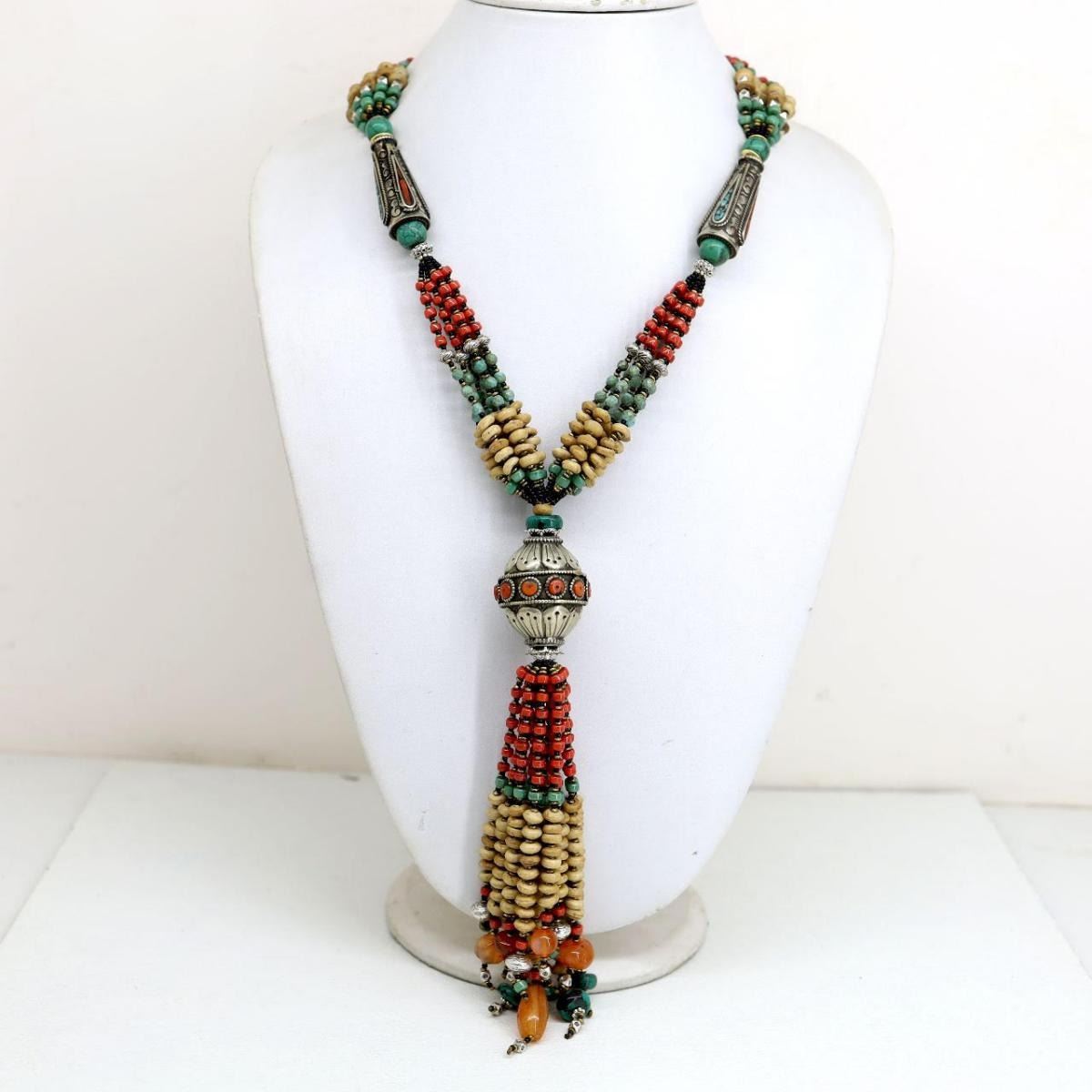 Tibet Natural Stone Hand Made Turquoise, Coral Necklace......;This elegant large Necklace was handcrafted in Tibet, the home of exquisite jewelry craftsmanship. It was skillfully made with large natural Turquoise, each in a deep Tibetan Silver setting. and balance the design perfectly. Turquoise is used virtually worldwide for jewelry making, and is highly prized for its brilliant colors, which vary from mine to mine. The distinctive webbing patterns and variations of color in the stones on this wonderful piece are typical of the natural Turquoise found throughout much of the Himalayan region, where Turquoise has been used in jewelry-making since centuries.