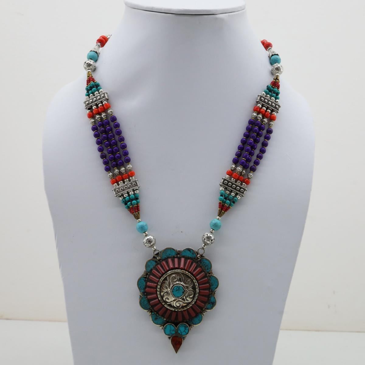 Tibet Natural Stone Hand Made Turquoise, Coral Necklace......;This elegant large Necklace was handcrafted in Tibet, the home of exquisite jewelry craftsmanship. It was skillfully made with large natural Turquoise, each in a deep Tibetan Silver setting. and balance the design perfectly. Turquoise is used virtually worldwide for jewelry making, and is highly prized for its brilliant colors, which vary from mine to mine. The distinctive webbing patterns and variations of color in the stones on this wonderful piece are typical of the natural Turquoise found throughout much of the Himalayan region, where Turquoise has been used in jewelry-making since centuries.