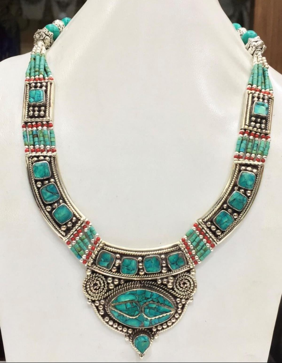 Tibet Hand Made Natural Turquoise & Coral Royal Necklace .....This elegant large Necklace was handcrafted in Tibet, the home of exquisite jewelry craftsmanship. It was skillfully made with large natural Turquoise, each in a deep Tibetan Silver setting. and balance the design perfectly. Turquoise is used virtually worldwide for jewelry making, and is highly prized for its brilliant colors, which vary from mine to mine. The distinctive webbing patterns and variations of color in the stones on this wonderful piece are typical of the natural Turquoise found throughout much of the Himalayan region, where Turquoise has been used in jewelry-making since centuries.