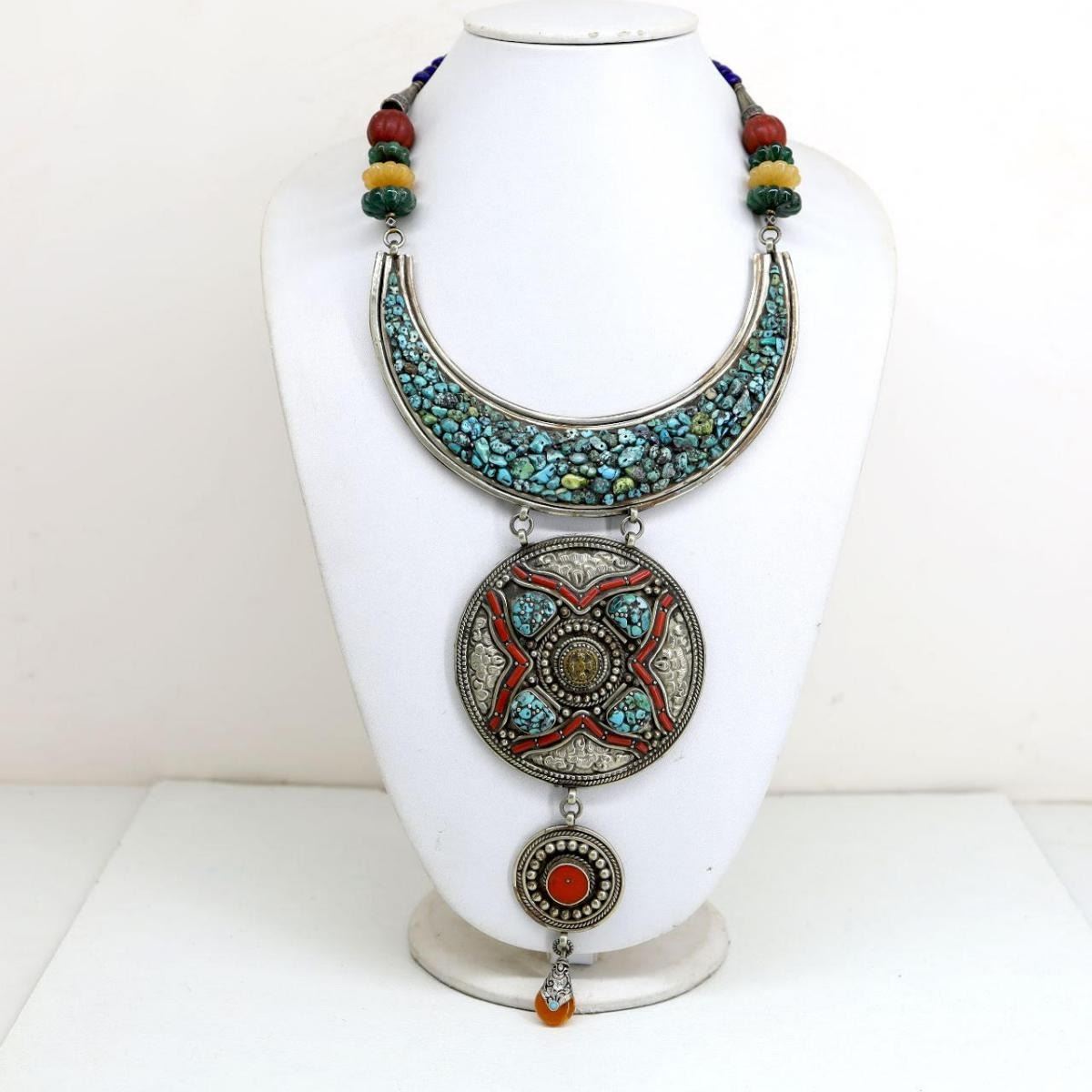 Tibet Hand Made Natural Turquoise Royal Necklace .....This elegant large Necklace was handcrafted in Tibet, the home of exquisite jewelry craftsmanship. It was skillfully made with large natural Turquoise, each in a deep Tibetan Silver setting. and balance the design perfectly. Turquoise is used virtually worldwide for jewelry making, and is highly prized for its brilliant colors, which vary from mine to mine. The distinctive webbing patterns and variations of color in the stones on this wonderful piece are typical of the natural Turquoise found throughout much of the Himalayan region, where Turquoise has been used in jewelry-making since centuries.