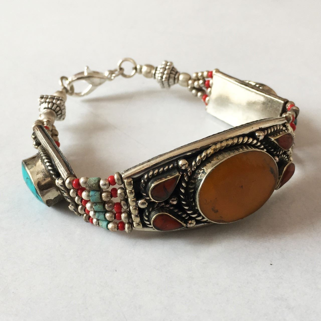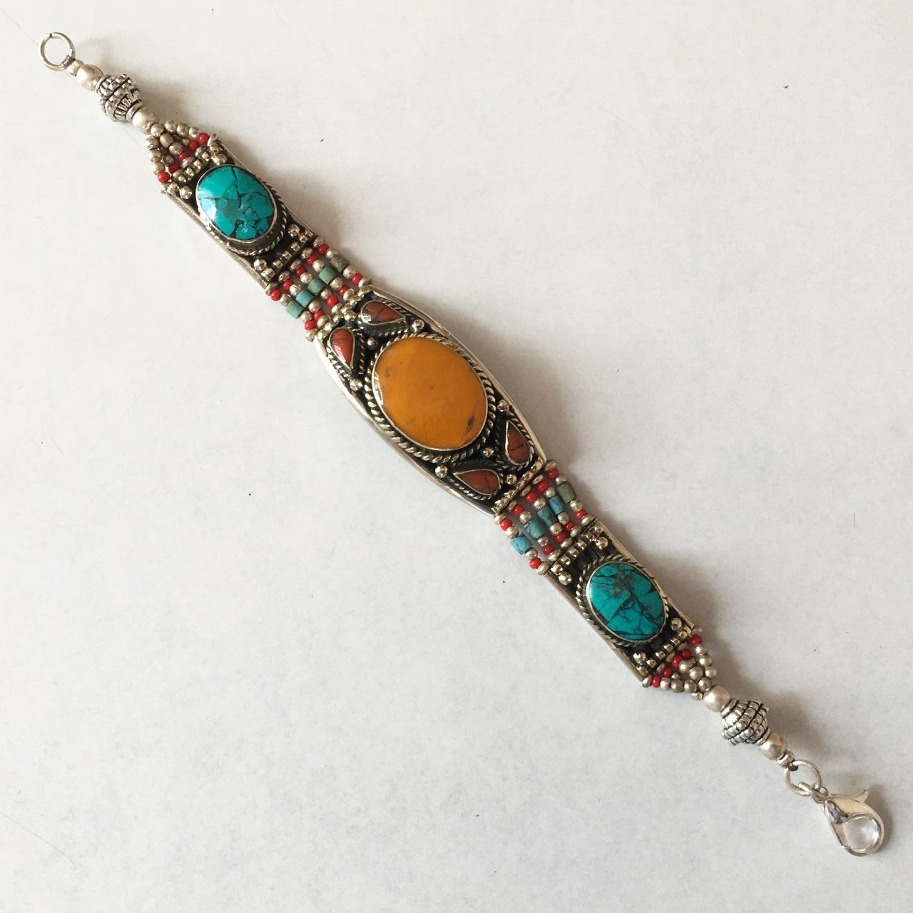 Tibet Natural Stone Hand Made Turquoise Bracelet.......This elegant large Bracelet was handcrafted in Tibet, the home of exquisite jewelry craftsmanship. It was skillfully made with natural Lapiz Lazuli, each in a deep Tibetan Silver setting. and balance the design perfectly. Turquoise is used virtually worldwide for jewelry making, and is highly prized for its brilliant colors, which vary from mine to mine. The distinctive webbing patterns and variations of color in the stones .”””Note- All stones in this Bracelet are Natural.....Guaranteed....Vintage look but Bracelet is brand new.