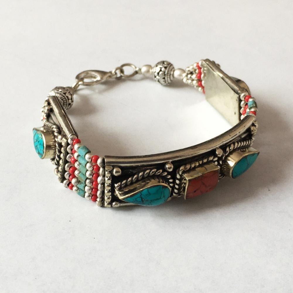 Tibet Natural Stone Hand Made Turquoise Bracelet.......This elegant Bracelet was handcrafted in Tibet, the home of exquisite jewelry craftsmanship. It was skillfully made with natural Lapiz Lazuli, each in a deep Tibetan Silver setting. and balance the design perfectly. Turquoise is used virtually worldwide for jewelry making, and is highly prized for its brilliant colors, which vary from mine to mine. The distinctive webbing patterns and variations of color in the stones ....Vintage look but Bracelet is brand new