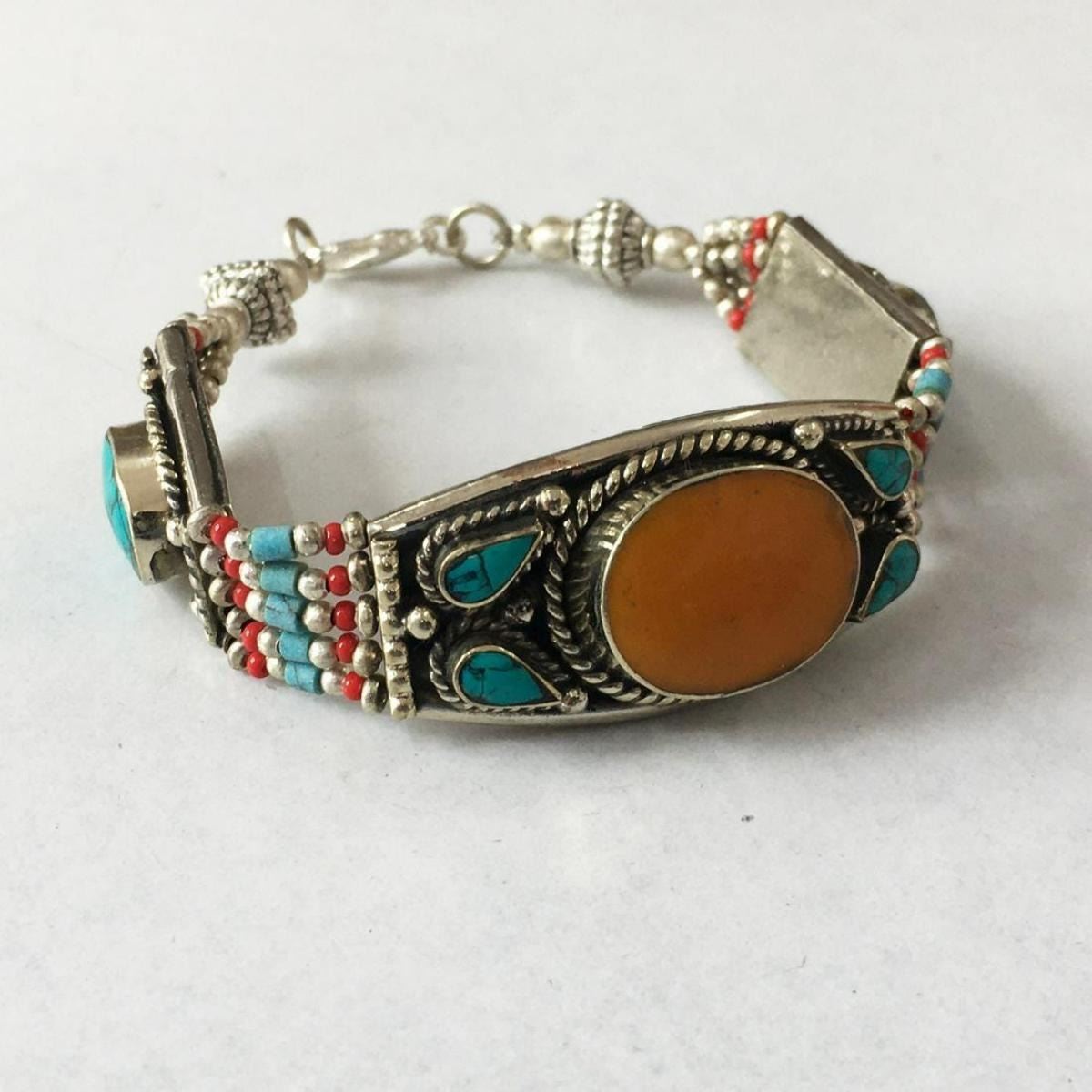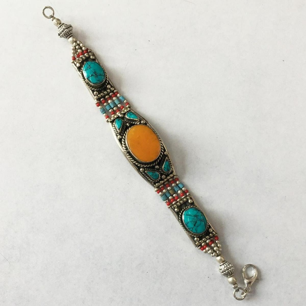 Tibet Natural Stone Hand Made Turquoise Bracelet.......This elegant large Bracelet was handcrafted in Tibet, the home of exquisite jewelry craftsmanship. It was skillfully made with natural Lapiz Lazuli, each in a deep Tibetan Silver setting. and balance the design perfectly. Turquoise is used virtually worldwide for jewelry making, and is highly prized for its brilliant colors, which vary from mine to mine. The distinctive webbing patterns and variations of color in the stones .”””Note- All stones in this Bracelet are Natural.....Guaranteed....Vintage look but Bracelet is brand new.