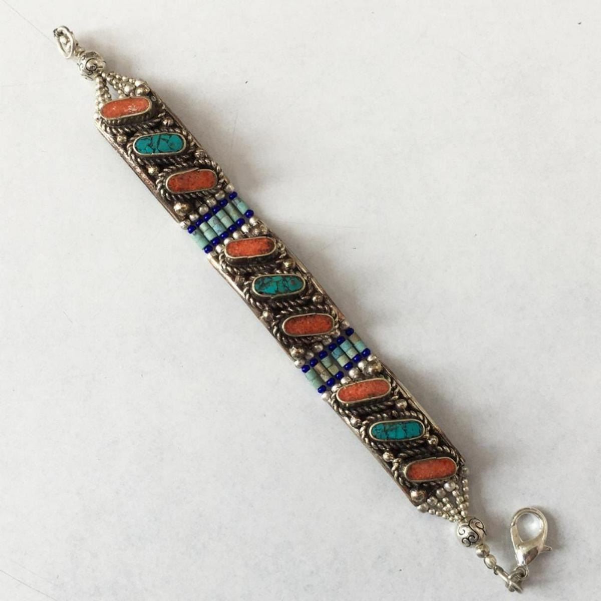 Tibet Natural Stone Hand Made Turquoise Bracelet.......This elegant large Bracelet was handcrafted in Tibet, the home of exquisite jewelry craftsmanship. It was skillfully made with natural Lapiz Lazuli, each in a deep Tibetan Silver setting. and balance the design perfectly. Turquoise is used virtually worldwide for jewelry making, and is highly prized for its brilliant colors, which vary from mine to mine. The distinctive webbing patterns and variations of color in the stones ..Vintage look but Bracelet is brand new.