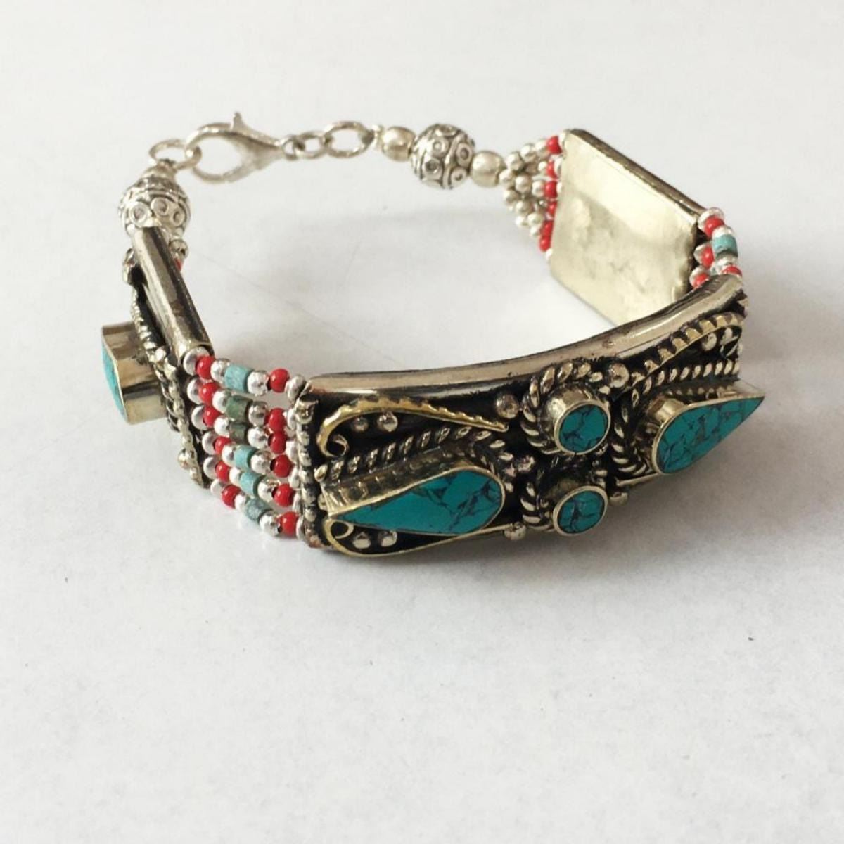 Tibet Natural Stone Hand Made Turquoise Bracelet.......This elegant Bracelet was handcrafted in Tibet, the home of exquisite jewelry craftsmanship. It was skillfully made with natural Lapiz Lazuli, each in a deep Tibetan Silver setting. and balance the design perfectly. Turquoise is used virtually worldwide for jewelry making, and is highly prized for its brilliant colors, which vary from mine to mine. The distinctive webbing patterns and variations of color in the stones ....Vintage look but Bracelet is brand new