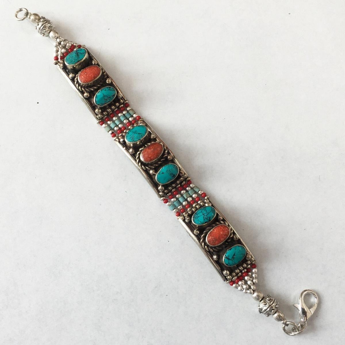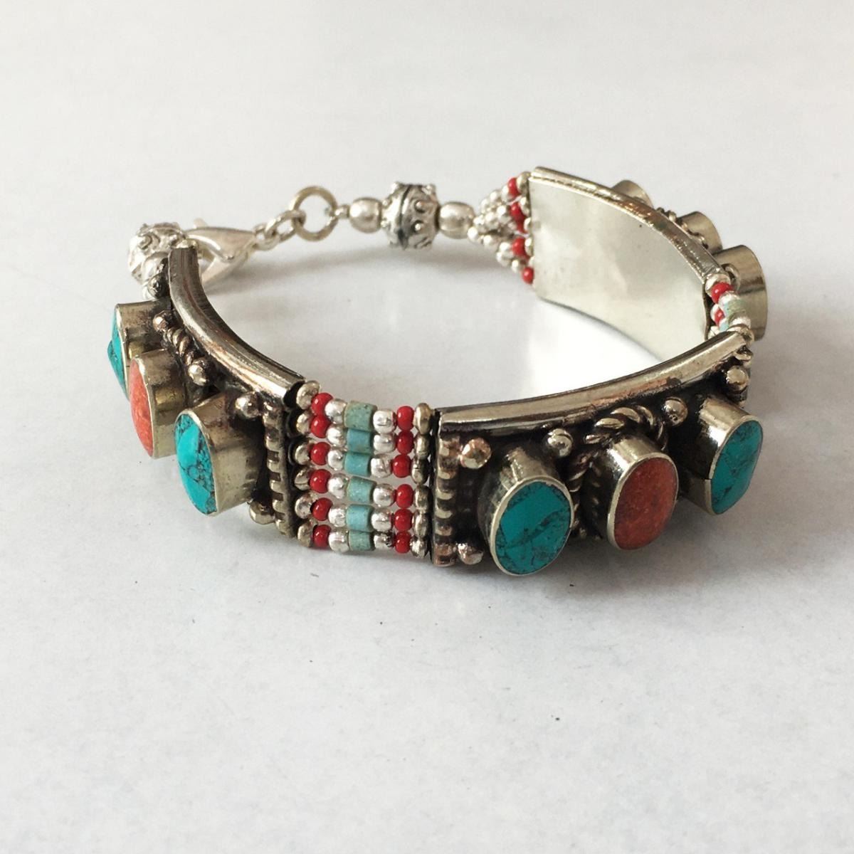 Tibet Natural Stone Hand Made Turquoise Bracelet.......This elegant large Bracelet was handcrafted in Tibet, the home of exquisite jewelry craftsmanship. It was skillfully made with natural Lapiz Lazuli, each in a deep Tibetan Silver setting. and balance the design perfectly. Turquoise is used virtually worldwide for jewelry making, and is highly prized for its brilliant colors, which vary from mine to mine. The distinctive webbing patterns and variations of color in the stones ..Vintage look but Bracelet is brand new.