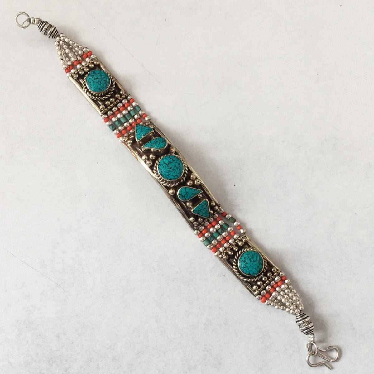 Tibet Natural Stone Hand Made Turquoise Bracelet.......This elegant large Bracelet was handcrafted in Tibet, the home of exquisite jewelry craftsmanship. It was skillfully made with natural Lapiz Lazuli, each in a deep Tibetan Silver setting. and balance the design perfectly. Turquoise is used virtually worldwide for jewelry making, and is highly prized for its brilliant colors, which vary from mine to mine. The distinctive webbing patterns and variations of color in the stones ..Vintage look but Bracelet is brand new.