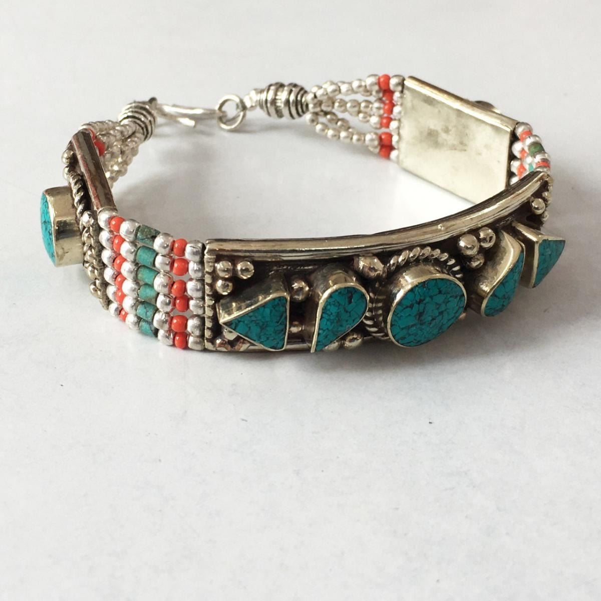 Tibet Natural Stone Hand Made Turquoise Bracelet.......This elegant large Bracelet was handcrafted in Tibet, the home of exquisite jewelry craftsmanship. It was skillfully made with natural Lapiz Lazuli, each in a deep Tibetan Silver setting. and balance the design perfectly. Turquoise is used virtually worldwide for jewelry making, and is highly prized for its brilliant colors, which vary from mine to mine. The distinctive webbing patterns and variations of color in the stones ..Vintage look but Bracelet is brand new.