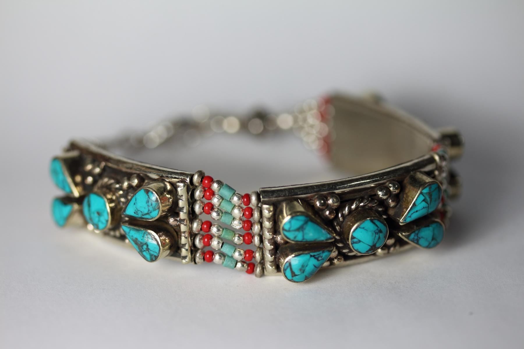 Tibet Natural Stone Hand Made Turquoise Bracelet.......This elegant large Bracelet was handcrafted in Tibet, the home of exquisite jewelry craftsmanship. It was skillfully made with natural Lapiz Lazuli, each in a deep Tibetan Silver setting. and balance the design perfectly. Turquoise is used virtually worldwide for jewelry making, and is highly prized for its brilliant colors, which vary from mine to mine. The distinctive webbing patterns and variations of color in the stones ..Vintage look but Bracelet is brand new.