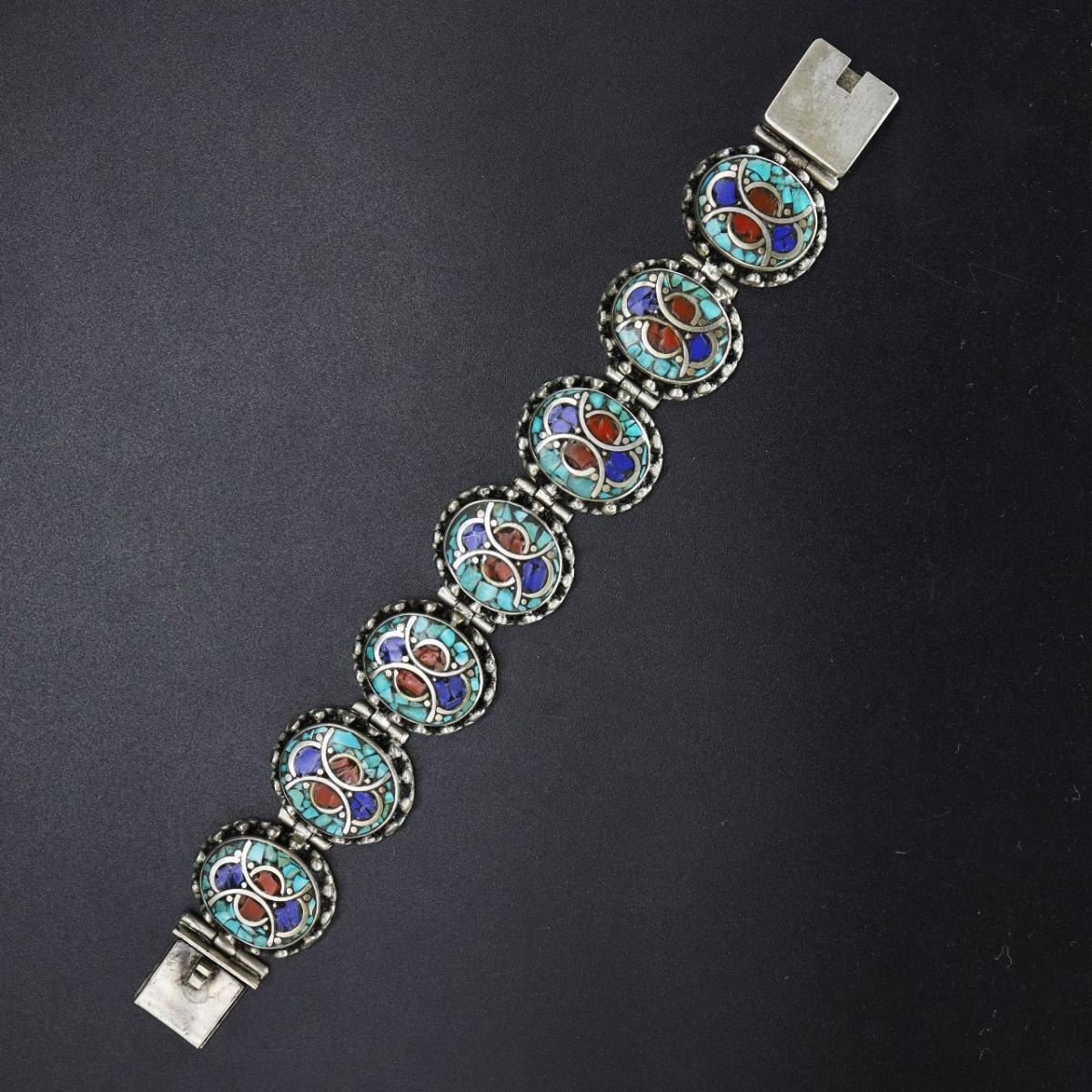 Tibet Natural Stone Hand Made Turquoise Bracelet.......This elegant large Bracelet was handcrafted in Tibet, the home of exquisite jewelry craftsmanship. It was skillfully made with natural Turquoise Lapiz Lazuli & Coral , each in a deep Tibetan Silver setting. and balance the design perfectly. Turquoise is used virtually worldwide for jewelry making, and is highly prized for its brilliant colors, which vary from mine to mine. The distinctive webbing patterns and variations of color in the stones ..Vintage look but Bracelet is brand new.