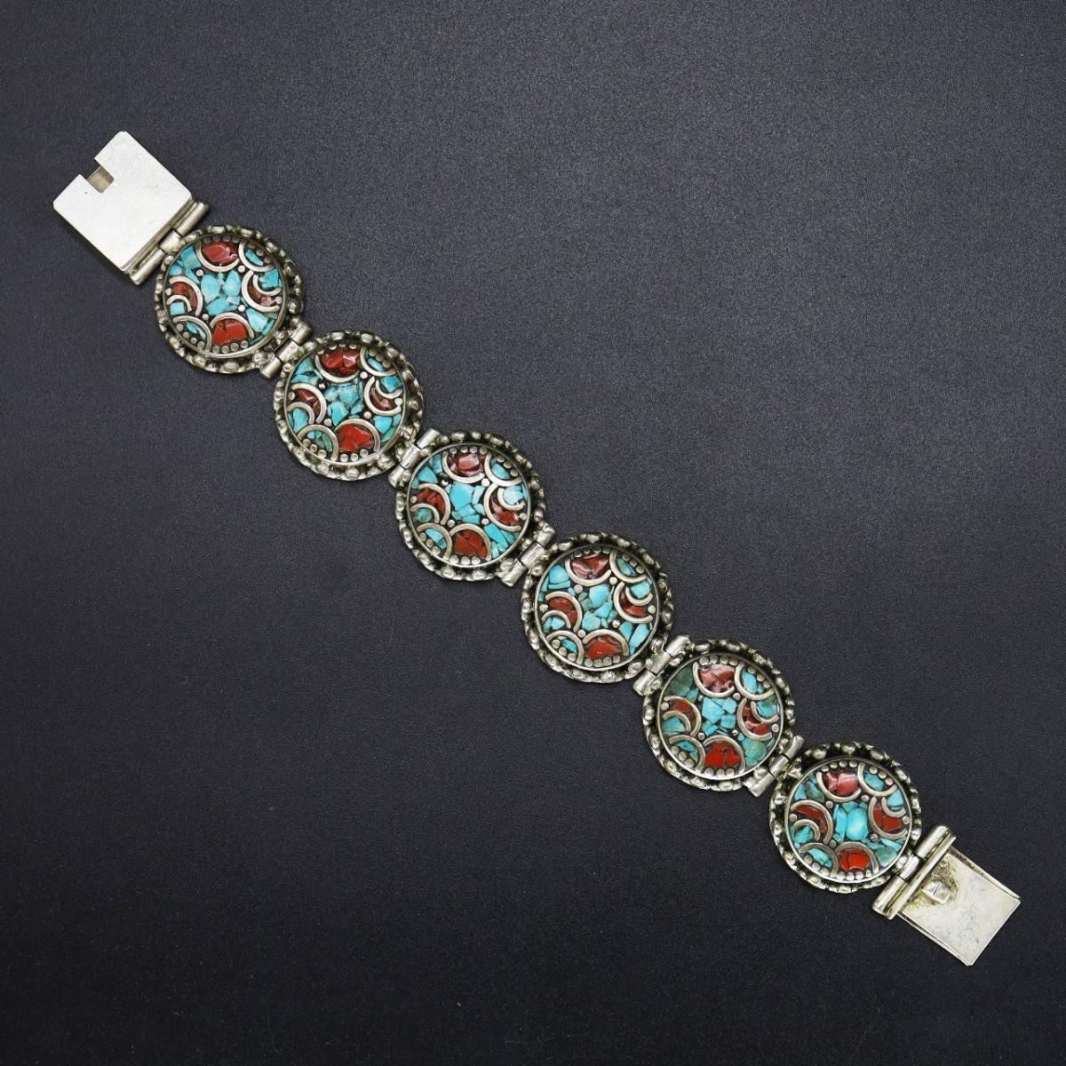 Tibet Natural Stone Hand Made Turquoise Bracelet.......This elegant large Bracelet was handcrafted in Tibet, the home of exquisite jewelry craftsmanship. It was skillfully made with natural Turquoise & Coral , each in a deep Tibetan Silver setting. and balance the design perfectly. Turquoise is used virtually worldwide for jewelry making, and is highly prized for its brilliant colors, which vary from mine to mine. The distinctive webbing patterns and variations of color in the stones ..Vintage look but Bracelet is brand new.