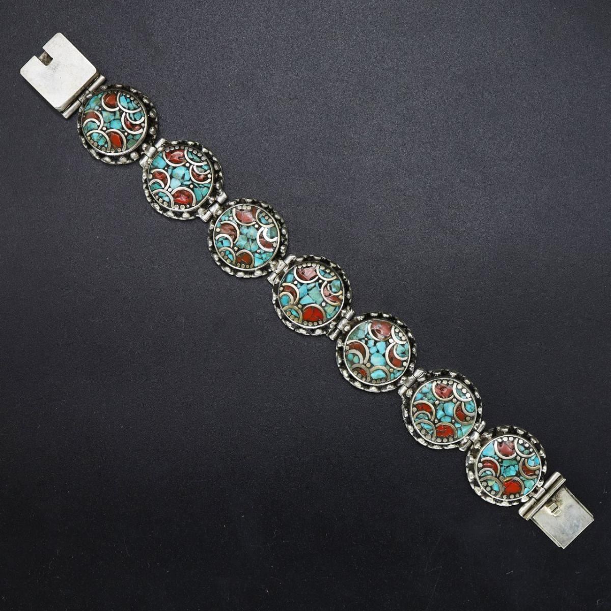 Tibet Natural Stone Hand Made Turquoise Bracelet.......This elegant large Bracelet was handcrafted in Tibet, the home of exquisite jewelry craftsmanship. It was skillfully made with natural Turquoise & Coral , each in a deep Tibetan Silver setting. and balance the design perfectly. Turquoise is used virtually worldwide for jewelry making, and is highly prized for its brilliant colors, which vary from mine to mine. The distinctive webbing patterns and variations of color in the stones ..Vintage look but Bracelet is brand new.