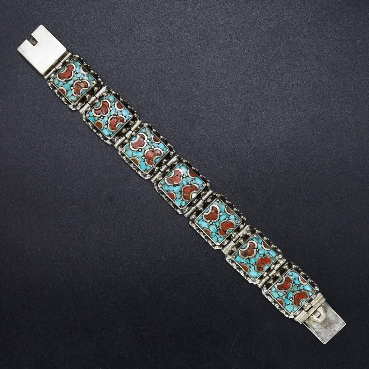 Tibet Natural Stone Hand Made Turquoise Bracelet.......This elegant large Bracelet was handcrafted in Tibet, the home of exquisite jewelry craftsmanship. It was skillfully made with natural Turquoise & Coral , each in a deep Tibetan Silver setting. and balance the design perfectly. Turquoise is used virtually worldwide for jewelry making, and is highly prized for its brilliant colors, which vary from mine to mine. The distinctive webbing patterns and variations of color in the stones ..Vintage look but Bracelet is brand new.
