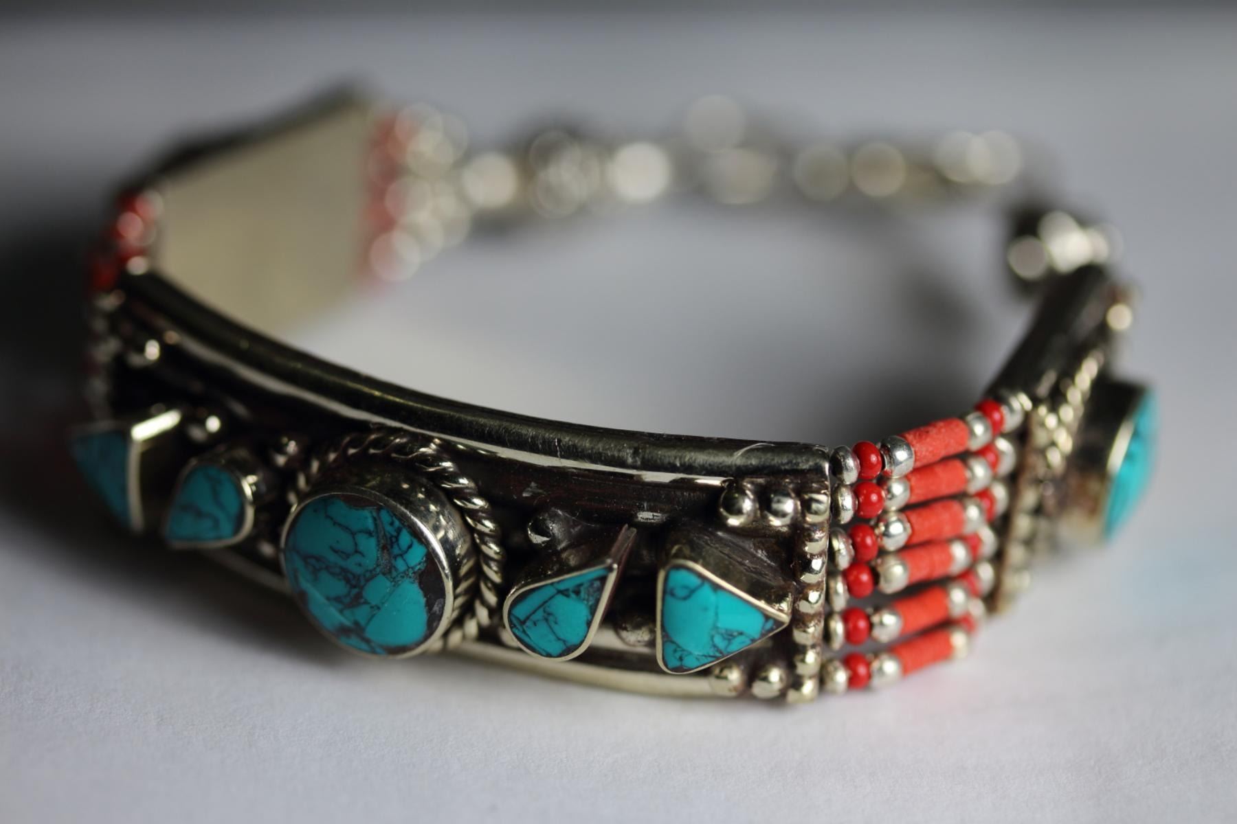 Tibet Natural Stone Hand Made Turquoise, Coral Bracelet.......This elegant large Bracelet was handcrafted in Tibet, the home of exquisite jewelry craftsmanship. It was skillfully made with natural Turquoise, each in a deep Tibetan Silver setting. and balance the design perfectly. Turquoise is used virtually worldwide for jewelry making, and is highly prized for its brilliant colors, which vary from mine to mine. The distinctive webbing patterns and variations of color in the stones on this wonderful piece are typical of the natural Turquoise found throughout much of the Himalayan region, where Turquoise has been used in jewelry-making since centuries.”””Note- All stones in this Bracelet are Natural.....Guaranteed....Vintage look but Bracelet is brand new.