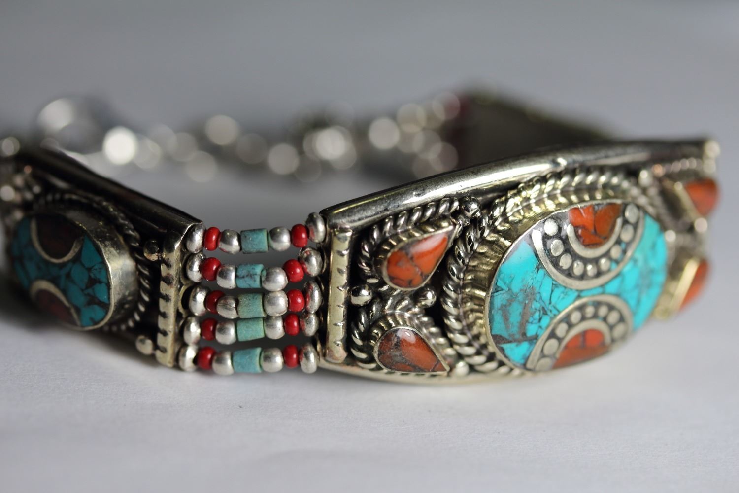 Tibet Natural Stone Hand Made Turquoise, Coral Bracelet.......This elegant large Bracelet was handcrafted in Tibet, the home of exquisite jewelry craftsmanship. It was skillfully made with natural Turquoise, each in a deep Tibetan Silver setting. and balance the design perfectly. Turquoise is used virtually worldwide for jewelry making, and is highly prized for its brilliant colors, which vary from mine to mine. The distinctive webbing patterns and variations of color in the stones on this wonderful piece are typical of the natural Turquoise found throughout much of the Himalayan region, where Turquoise has been used in jewelry-making since centuries.”””Note- All stones in this Bracelet are Natural.....Guaranteed....Vintage look but Bracelet is brand new.