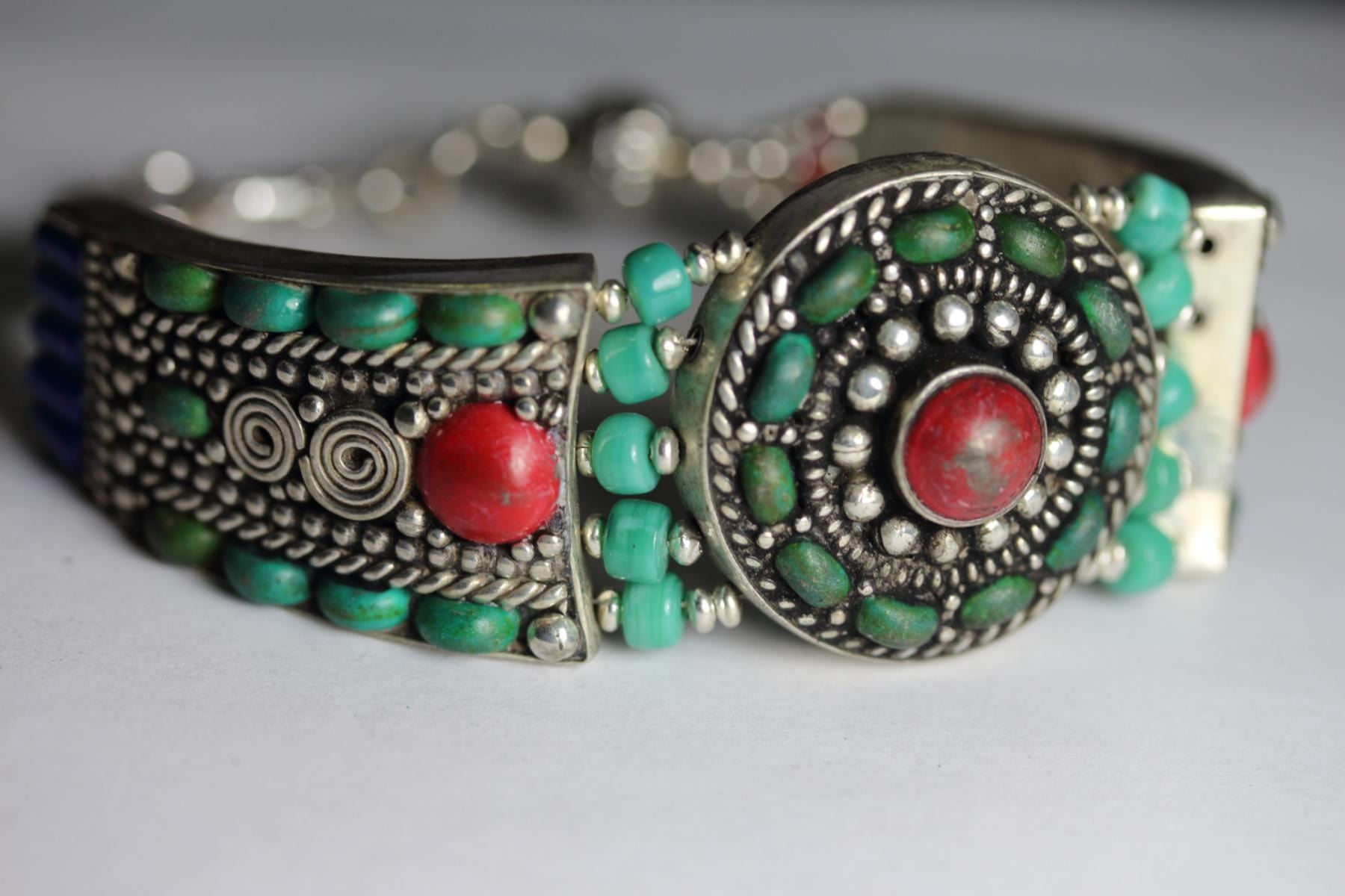Tibet Natural Stone Hand Made Turquoise, coral Bracelet.......This elegant large Bracelet was handcrafted in Tibet, the home of exquisite jewelry craftsmanship. It was skillfully made with natural Turquoise, each in a deep Tibetan Silver setting. and balance the design perfectly. Turquoise is used virtually worldwide for jewelry making, and is highly prized for its brilliant colors, which vary from mine to mine. The distinctive webbing patterns and variations of color in the stones on this wonderful piece are typical of the natural Turquoise found throughout much of the Himalayan region, where Turquoise has been used in jewelry-making since centuries.”””Note- All stones in this Bracelet are Natural.....Guaranteed....Vintage look but Bracelet is brand new.