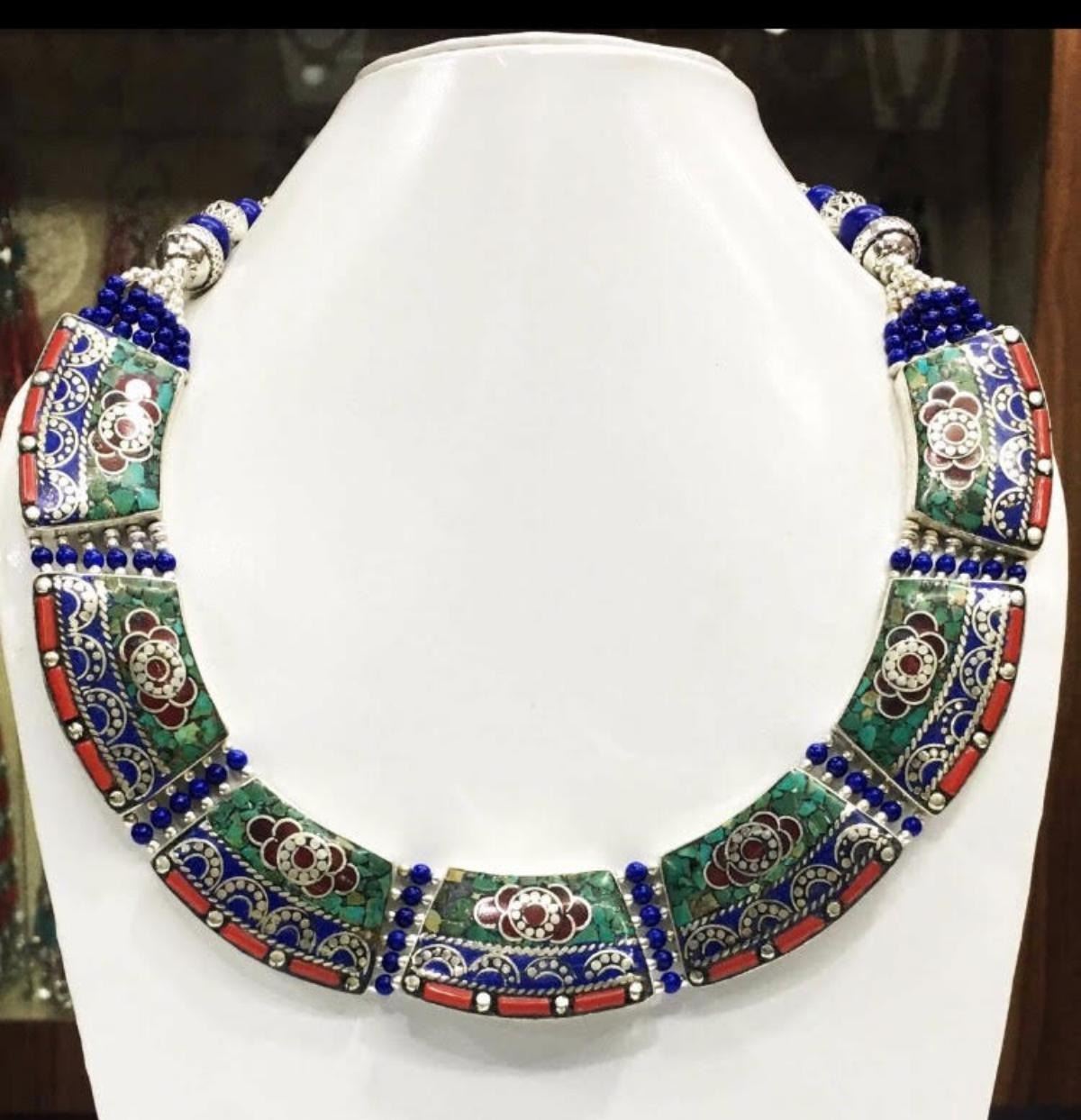 Tibet Natural Stone Hand Made Turquoise, Coral Lapis Lazuli Necklace.......This elegant large Necklace was handcrafted in Tibet, the home of exquisite jewelry craftsmanship. It was skillfully made with large natural Turquoise, each in a deep Tibetan Silver setting. and balance the design perfectly. Turquoise is used virtually worldwide for jewelry making, and is highly prized for its brilliant colors, which vary from mine to mine. The distinctive webbing patterns and variations of color in the stones on this wonderful piece are typical of the natural Turquoise found throughout much of the Himalayan region, where Turquoise has been used in jewelry-making since centuries.”””Note- All stones in this necklace are Natural.....Guranteed....Vintage look but necklace is brand new.