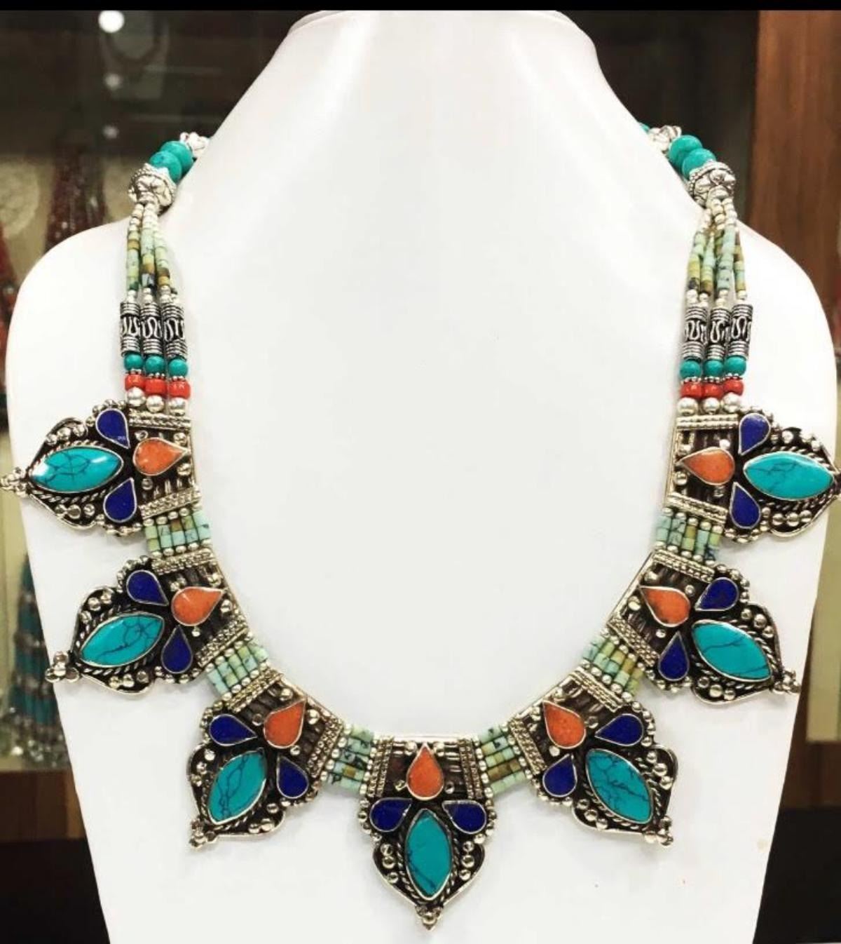 Tibet Natural Stone Hand Made Turquoise, Coral & Lapis Lazuli Necklace.......This elegant large Necklace was handcrafted in Tibet, the home of exquisite jewelry craftsmanship. It was skillfully made with large natural Turquoise, each in a deep Tibetan Silver setting. and balance the design perfectly. Turquoise is used virtually worldwide for jewelry making, and is highly prized for its brilliant colors, which vary from mine to mine. The distinctive webbing patterns and variations of color in the stones on this wonderful piece are typical of the natural Turquoise found throughout much of the Himalayan region, where Turquoise has been used in jewelry-making since centuries.”””Note- All stones in this necklace are Natural.....Guaranteed....Vintage look but necklace is brand new.