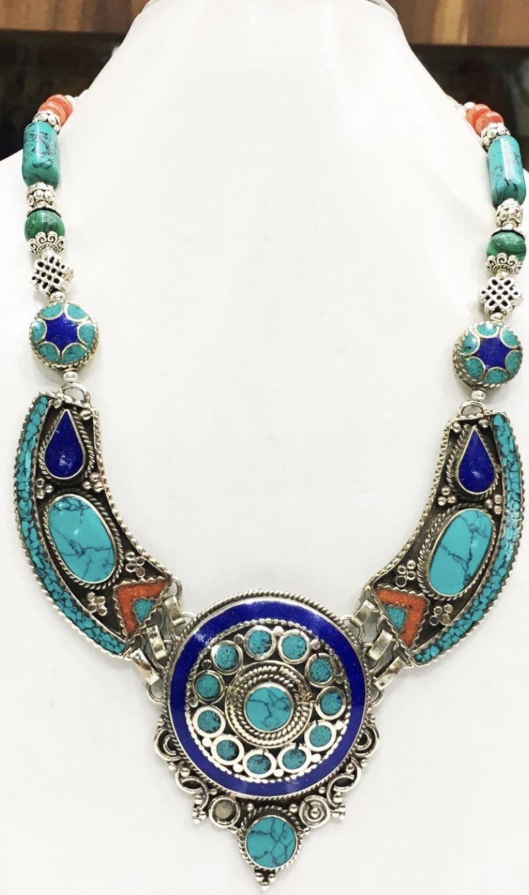 Tibet Natural Stone Hand Made Turquoise, Coral & Lapis Lazuli Necklace.......This elegant large Necklace was handcrafted in Tibet, the home of exquisite jewelry craftsmanship. It was skillfully made with large natural Turquoise, each in a deep Tibetan Silver setting. and balance the design perfectly. Turquoise is used virtually worldwide for jewelry making, and is highly prized for its brilliant colors, which vary from mine to mine. The distinctive webbing patterns and variations of color in the stones on this wonderful piece are typical of the natural Turquoise found throughout much of the Himalayan region, where Turquoise has been used in jewelry-making since centuries.”””Note- All stones in this necklace are Natural.....Guaranteed....Vintage look but necklace is brand new.