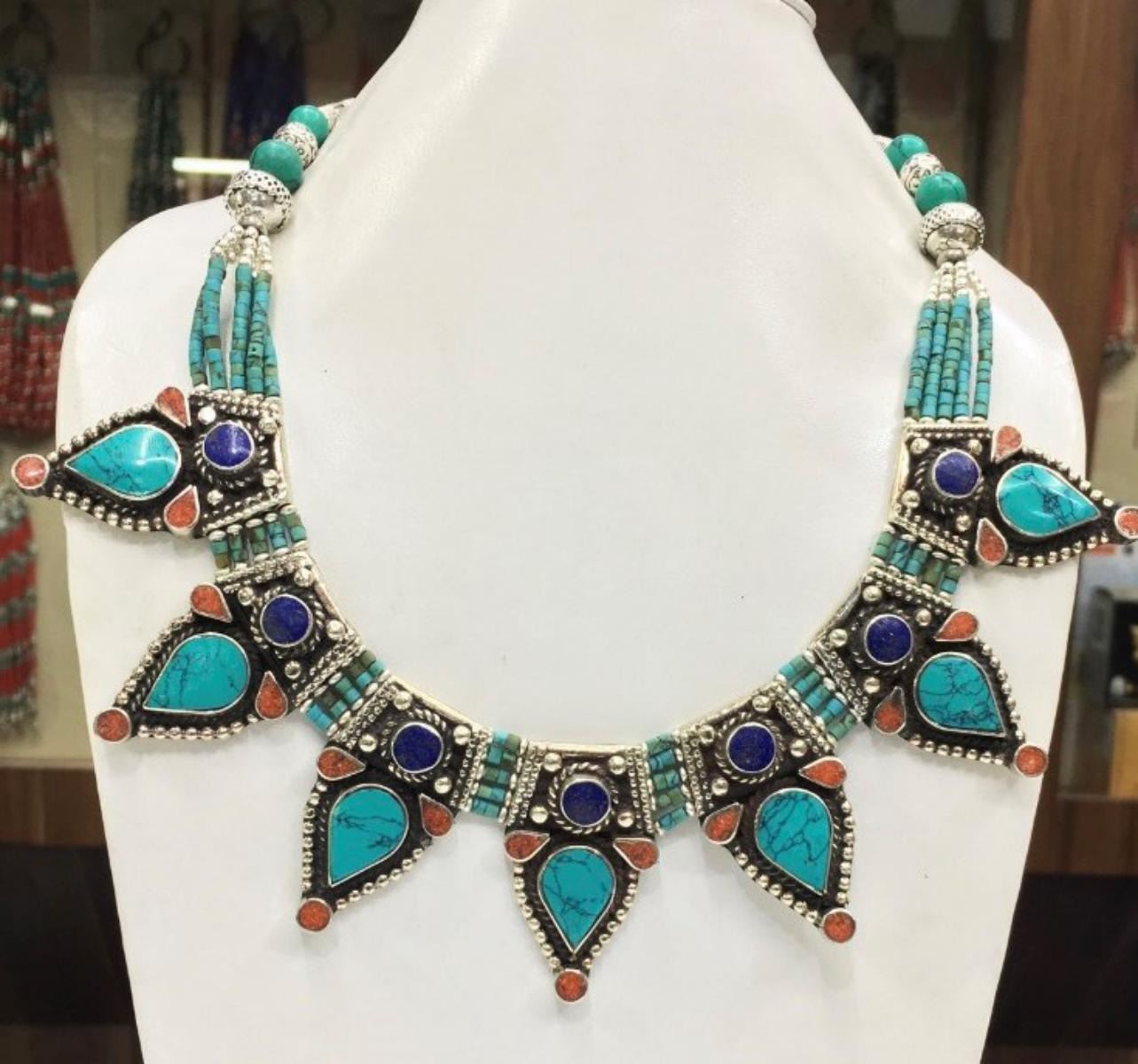 Tibet Natural Stone Hand Made Turquoise, Coral & Lapis Lazuli Necklace.......This elegant large Necklace was handcrafted in Tibet, the home of exquisite jewelry craftsmanship. It was skillfully made with large natural Turquoise, each in a deep Tibetan Silver setting. and balance the design perfectly. Turquoise is used virtually worldwide for jewelry making, and is highly prized for its brilliant colors, which vary from mine to mine. The distinctive webbing patterns and variations of color in the stones on this wonderful piece are typical of the natural Turquoise found throughout much of the Himalayan region, where Turquoise has been used in jewelry-making since centuries.”””Note- All stones in this necklace are Natural.....Guaranteed....Vintage look but necklace is brand new.