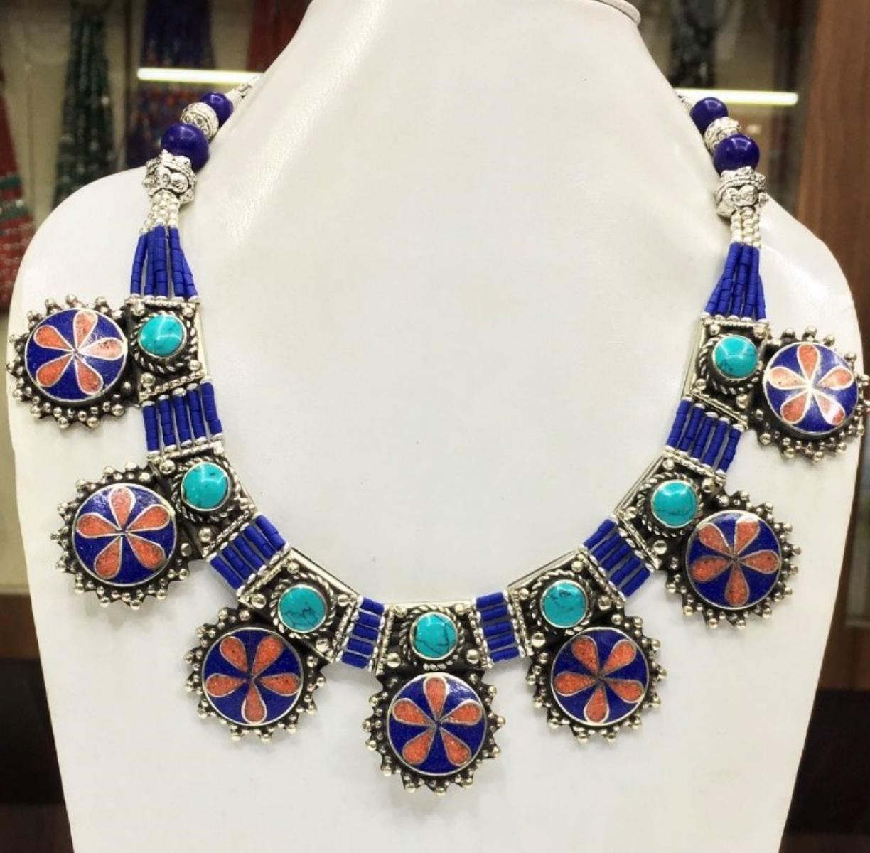 Tibet Natural Stone Hand Made Turquoise, Coral & Lapis Lazuli Necklace.......This elegant large Necklace was handcrafted in Tibet, the home of exquisite jewelry craftsmanship. It was skillfully made with large natural Turquoise, each in a deep Tibetan Silver setting. and balance the design perfectly. Turquoise is used virtually worldwide for jewelry making, and is highly prized for its brilliant colors, which vary from mine to mine. The distinctive webbing patterns and variations of color in the stones on this wonderful piece are typical of the natural Turquoise found throughout much of the Himalayan region, where Turquoise has been used in jewelry-making since centuries.”””Note- All stones in this necklace are Natural.....Guaranteed....Vintage look but necklace is brand new.