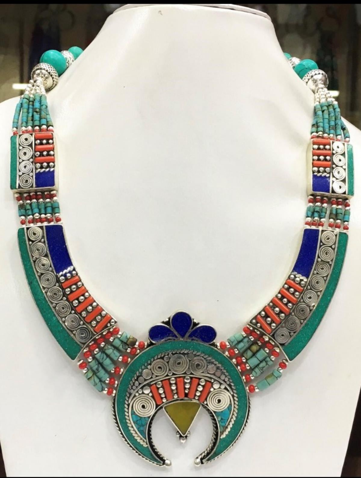 Tibet Natural Stone Hand Made Turquoise, Coral & Lapis Lazuli Necklace.......This elegant large Necklace was handcrafted in Tibet, the home of exquisite jewelry craftsmanship. It was skillfully made with large natural Turquoise, each in a deep Tibetan Silver setting. and balance the design perfectly. Turquoise is used virtually worldwide for jewelry making, and is highly prized for its brilliant colors, which vary from mine to mine. The distinctive webbing patterns and variations of color in the stones on this wonderful piece are typical of the natural Turquoise found throughout much of the Himalayan region, where Turquoise has been used in jewelry-making since centuries.”””Note- All stones in this necklace are Natural.....Guaranteed....Vintage look but necklace is brand new.