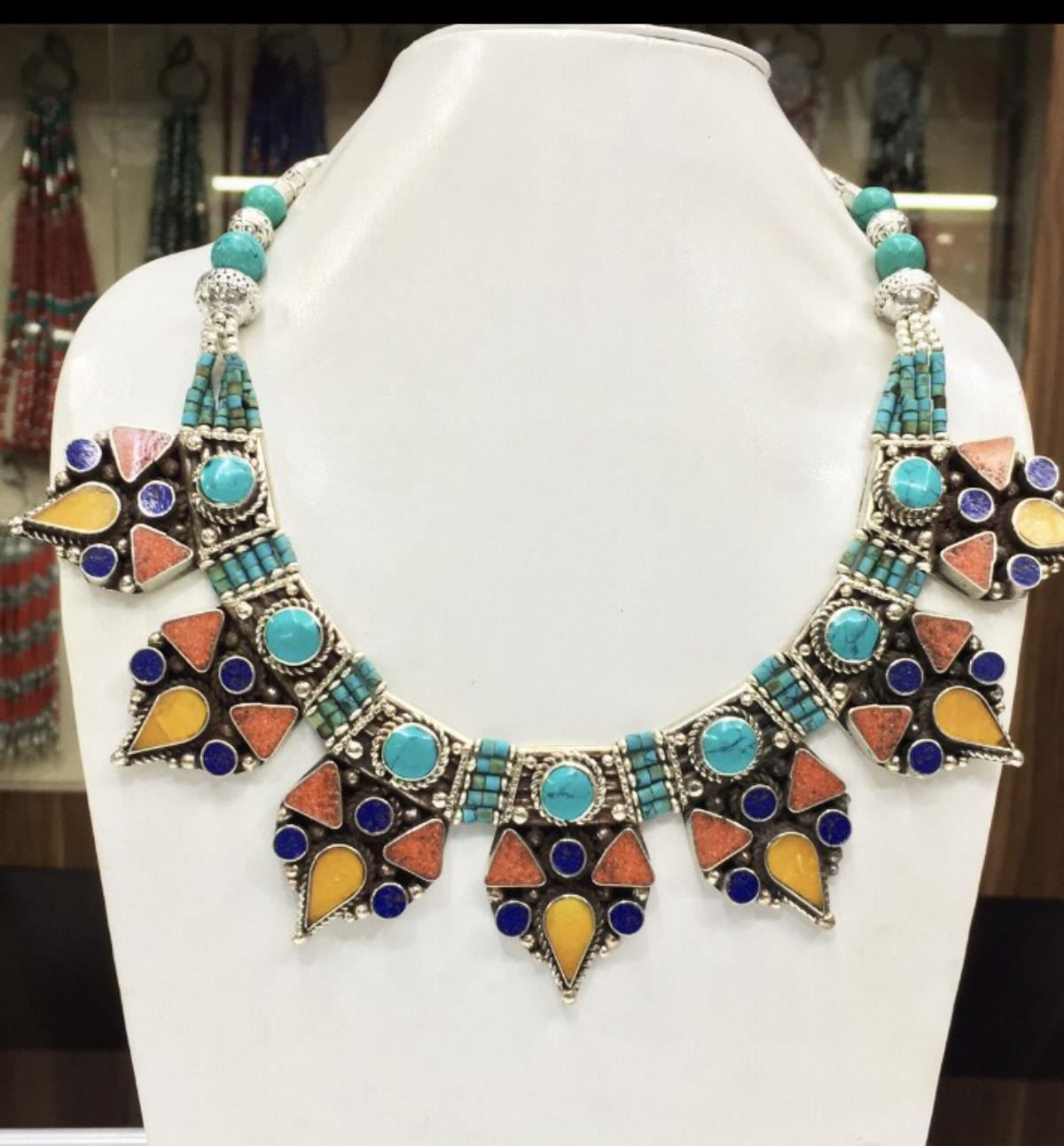 Tibet Natural Stone Hand Made Turquoise, Coral & Lapis Lazuli Necklace.......This elegant large Necklace was handcrafted in Tibet, the home of exquisite jewelry craftsmanship. It was skillfully made with large natural Turquoise, each in a deep Tibetan Silver setting. and balance the design perfectly. Turquoise is used virtually worldwide for jewelry making, and is highly prized for its brilliant colors, which vary from mine to mine. The distinctive webbing patterns and variations of color in the stones on this wonderful piece are typical of the natural Turquoise found throughout much of the Himalayan region, where Turquoise has been used in jewelry-making since centuries.Note- All stones in this necklace are Natural.....Guaranteed....Vintage look but necklace is brand new.