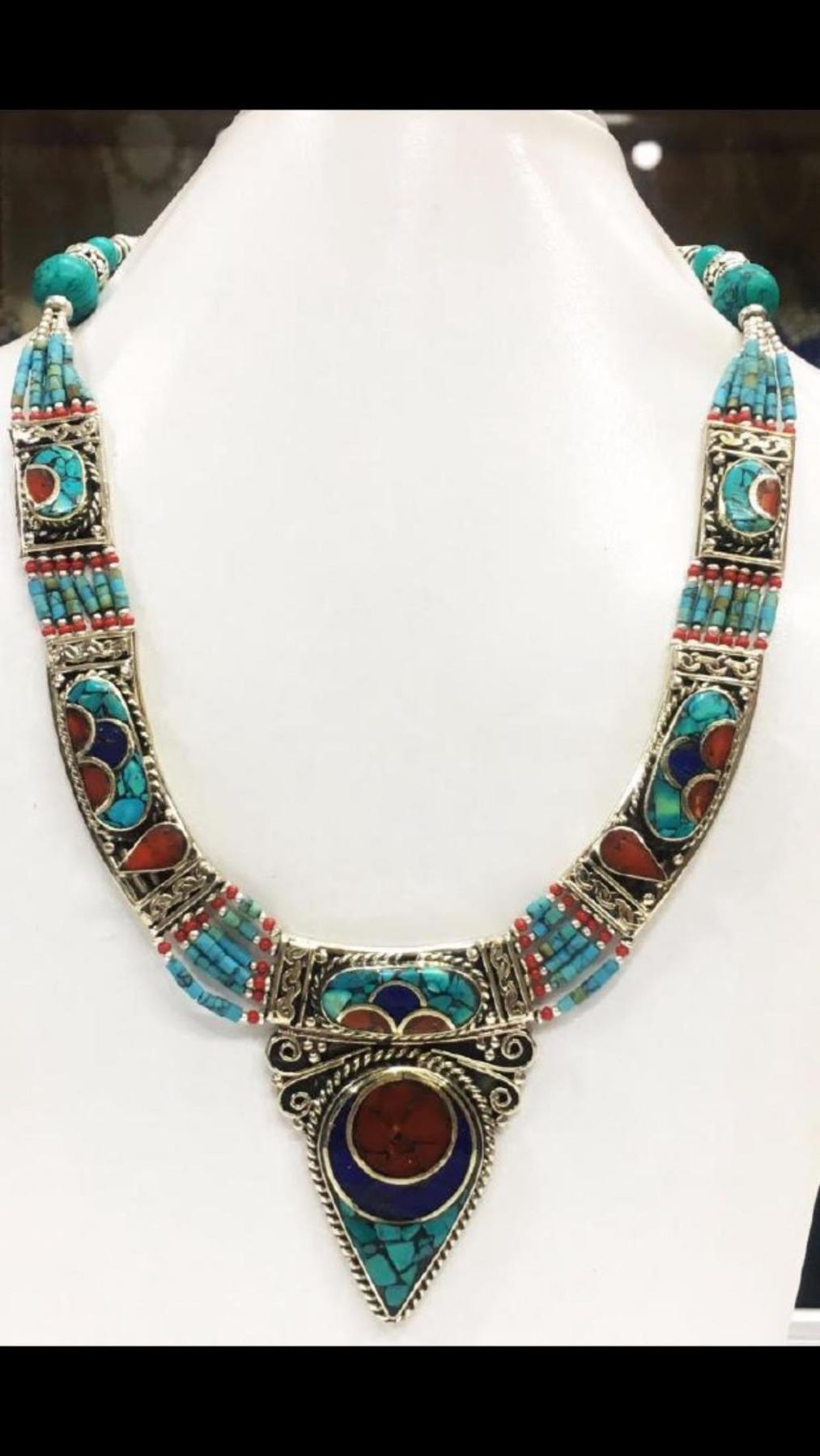 Tibet Natural Stone Hand Made Turquoise, Coral Lapis Lazuli Necklace.......This elegant large Necklace was handcrafted in Tibet, the home of exquisite jewelry craftsmanship. It was skillfully made with large natural Turquoise, each in a deep Tibetan Silver setting. and balance the design perfectly. Turquoise is used virtually worldwide for jewelry making, and is highly prized for its brilliant colors, which vary from mine to mine. The distinctive webbing patterns and variations of color in the stones on this wonderful piece are typical of the natural Turquoise found throughout much of the Himalayan region, where Turquoise has been used in jewelry-making since centuries.Note- All stones in this necklace are Natural.....Guranteed....Vintage look but necklace is brand new.