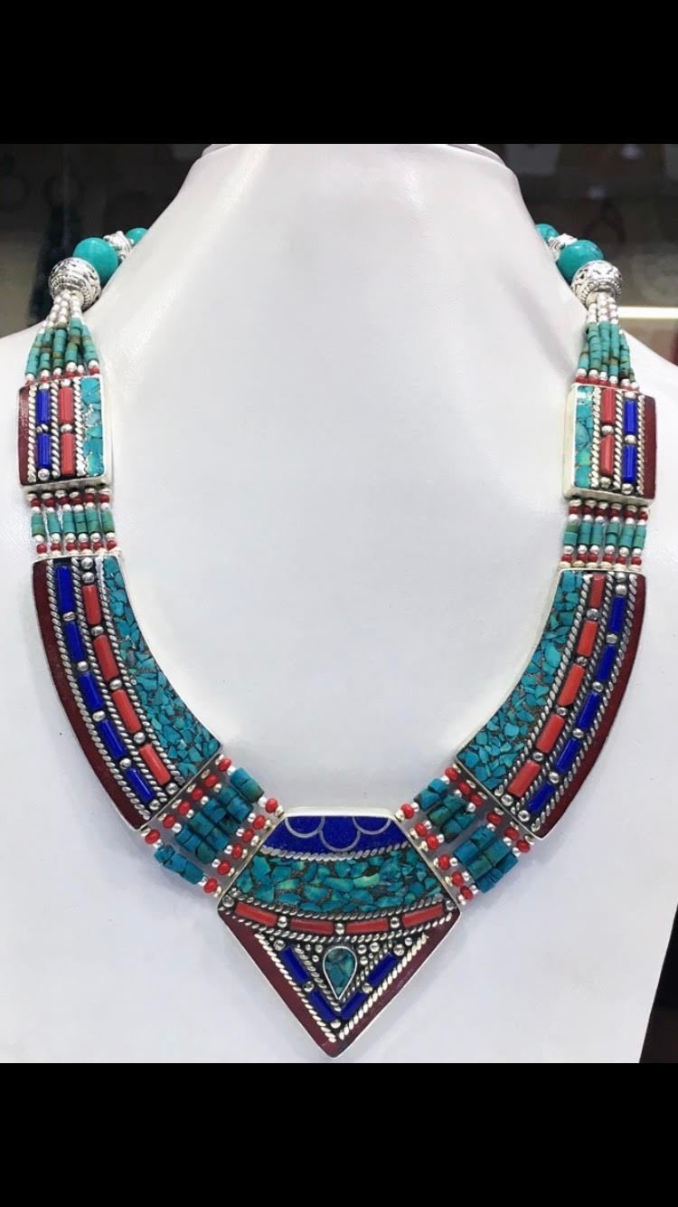 Tibet Natural Stone Hand Made Turquoise, Coral & Lapis Lazuli Necklace.......This elegant large Necklace was handcrafted in Tibet, the home of exquisite jewelry craftsmanship. It was skillfully made with large natural Turquoise, each in a deep Tibetan Silver setting. and balance the design perfectly. Turquoise is used virtually worldwide for jewelry making, and is highly prized for its brilliant colors, which vary from mine to mine. The distinctive webbing patterns and variations of color in the stones on this wonderful piece are typical of the natural Turquoise found throughout much of the Himalayan region, where Turquoise has been used in jewelry-making since centuries.”””Note- All stones in this necklace are Natural.....Guaranteed....Vintage look but necklace is brand new.