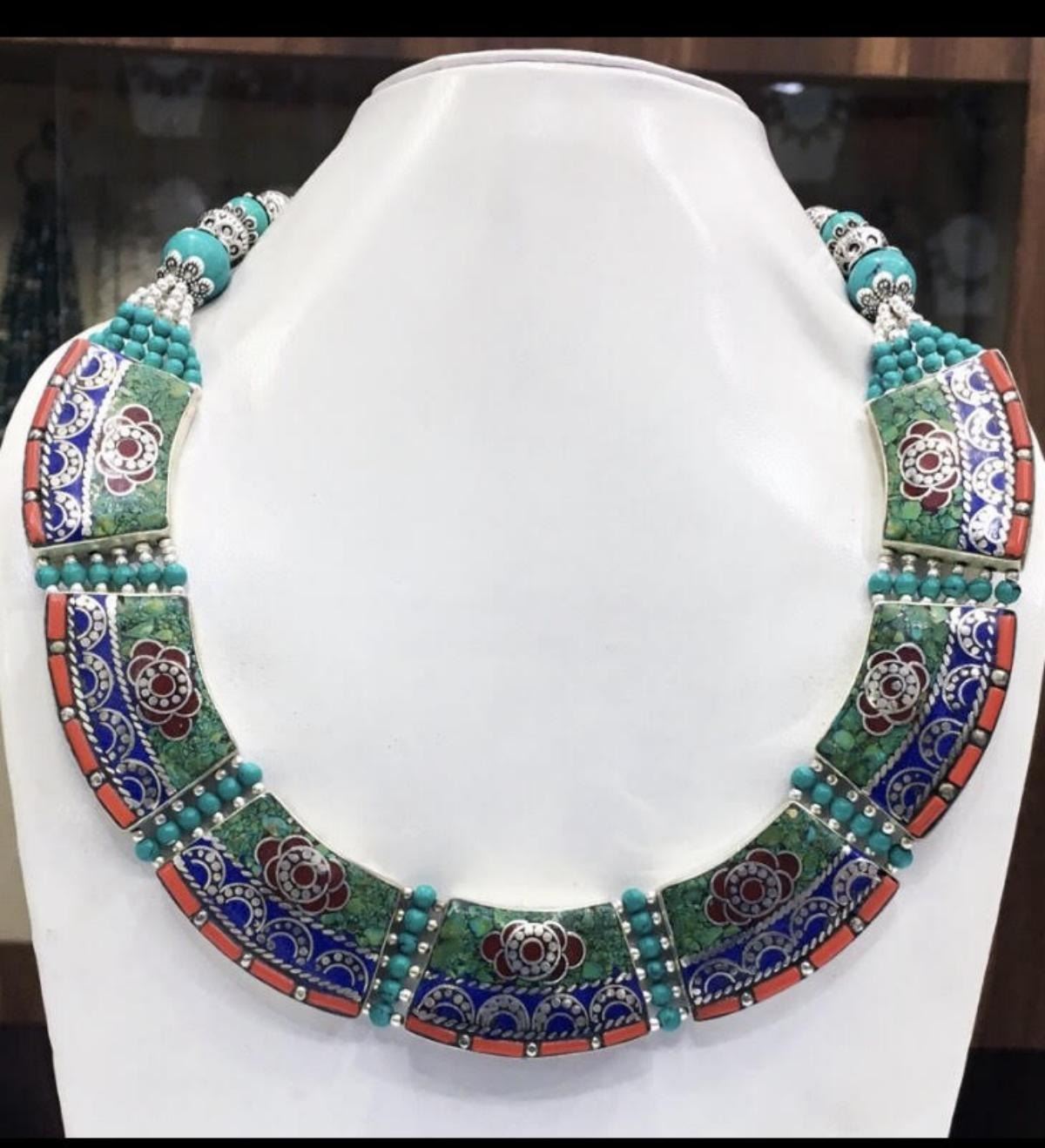 Tibet Natural Stone Hand Made Turquoise, Coral & Lapis Lazuli Necklace.......This elegant large Necklace was handcrafted in Tibet, the home of exquisite jewelry craftsmanship. It was skillfully made with large natural Turquoise, each in a deep Tibetan Silver setting. and balance the design perfectly. Turquoise is used virtually worldwide for jewelry making, and is highly prized for its brilliant colors, which vary from mine to mine. The distinctive webbing patterns and variations of color in the stones on this wonderful piece are typical of the natural Turquoise found throughout much of the Himalayan region, where Turquoise has been used in jewelry-making since centuries.”””Note- All stones in this necklace are Natural.....Guaranteed....Vintage look but necklace is brand new.
