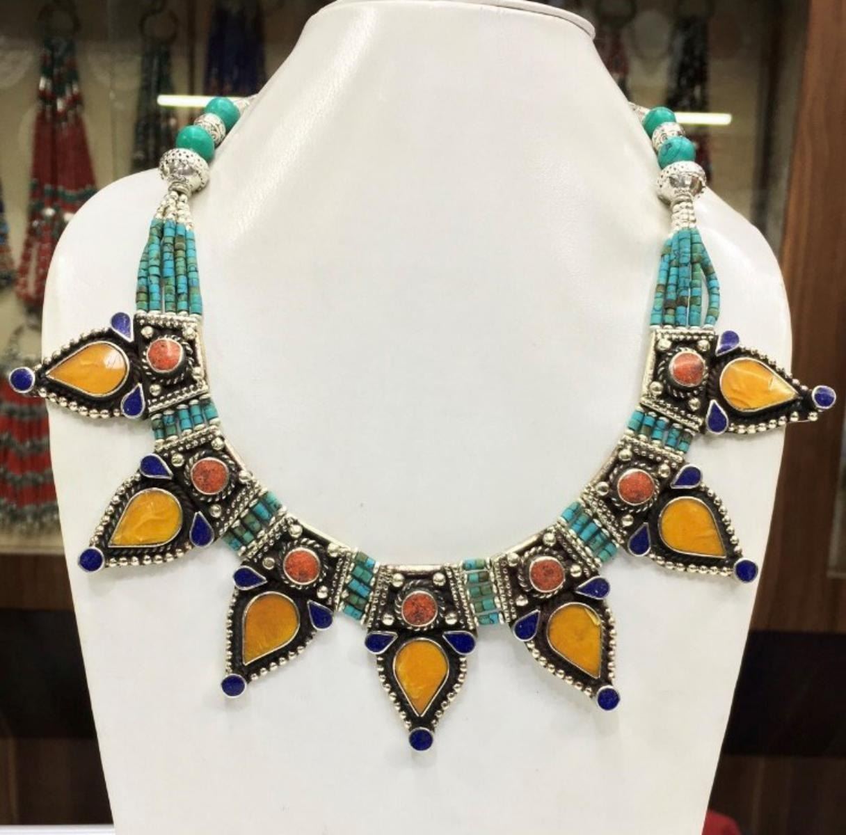 Tibet Natural Stone Hand Made Turquoise, Coral & Lapis Lazuli Necklace.......This elegant large Necklace was handcrafted in Tibet, the home of exquisite jewelry craftsmanship. It was skillfully made with large natural Turquoise, each in a deep Tibetan Silver setting. and balance the design perfectly. Turquoise is used virtually worldwide for jewelry making, and is highly prized for its brilliant colors, which vary from mine to mine. The distinctive webbing patterns and variations of color in the stones on this wonderful piece are typical of the natural Turquoise found throughout much of the Himalayan region, where Turquoise has been used in jewelry-making since centuries.”””Note- All stones in this necklace are Natural.....Guaranteed....Vintage look but necklace is brand new.
