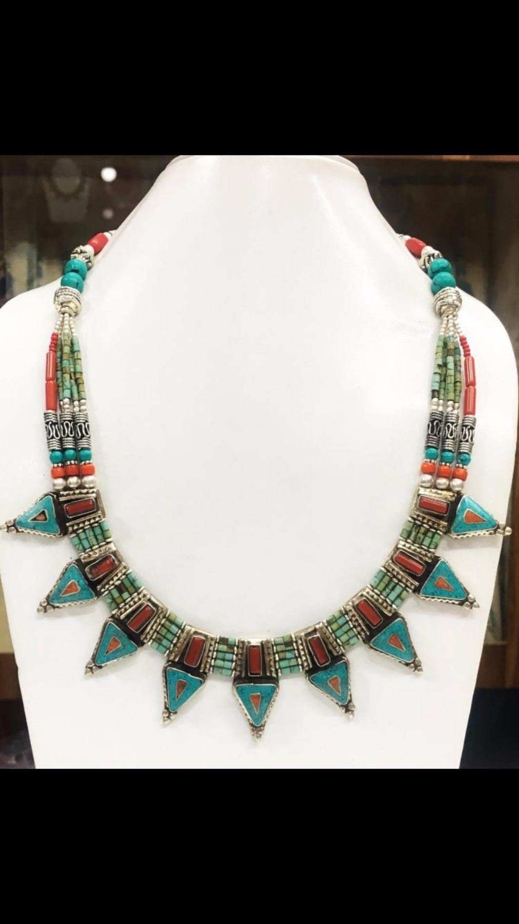 Tibet Natural Stone Hand Made Turquoise, Coral Necklace.......This elegant large Necklace was handcrafted in Tibet, the home of exquisite jewelry craftsmanship. It was skillfully made with large natural Turquoise, each in a deep Tibetan Silver setting. and balance the design perfectly. Turquoise is used virtually worldwide for jewelry making, and is highly prized for its brilliant colors, which vary from mine to mine. The distinctive webbing patterns and variations of color in the stones on this wonderful piece are typical of the natural Turquoise found throughout much of the Himalayan region, where Turquoise has been used in jewelry-making since centuries.”””Note- All stones in this necklace are Natural.....Guranteed....Vintage look but necklace is brand new.