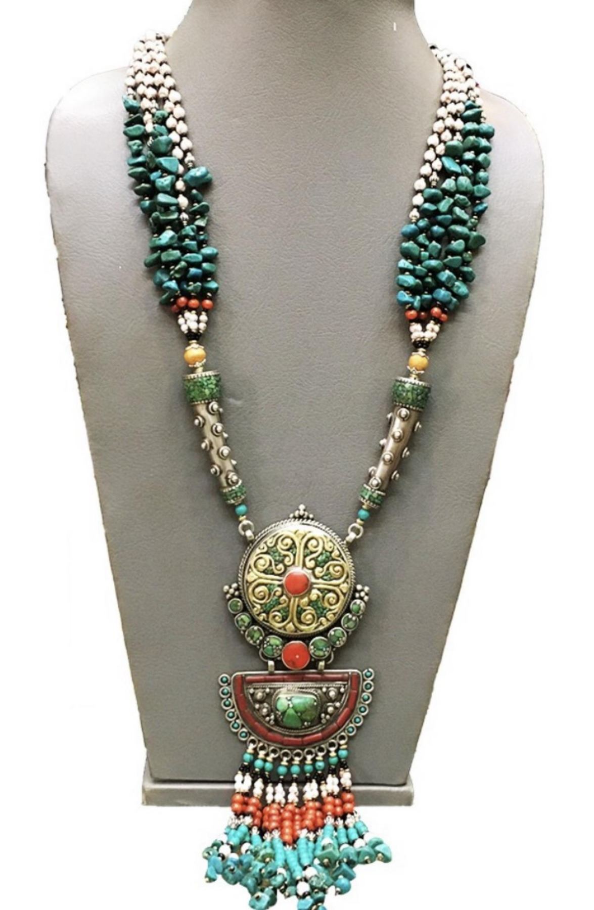 Tibet Natural Stone Hand Made Turquoise, Coral Necklace.......This elegant large Necklace was handcrafted in Tibet, the home of exquisite jewelry craftsmanship. It was skillfully made with large natural Turquoise, each in a deep Tibetan Silver setting. and balance the design perfectly. Turquoise is used virtually worldwide for jewelry making, and is highly prized for its brilliant colors, which vary from mine to mine. The distinctive webbing patterns and variations of color in the stones on this wonderful piece are typical of the natural Turquoise found throughout much of the Himalayan region, where Turquoise has been used in jewelry-making since centuries.”””Note- All stones in this necklace are Natural.....Guranteed....Vintage look but necklace is brand new.