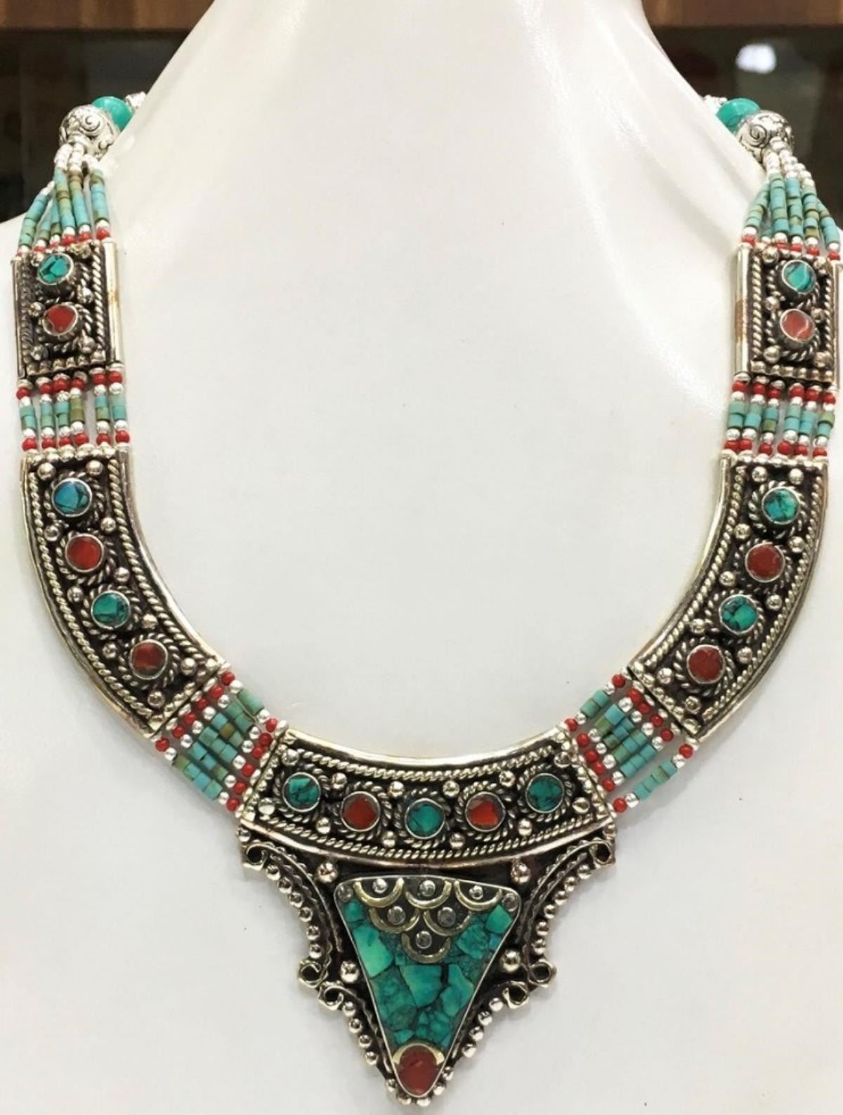 Tibet Natural Stone Hand Made Turquoise, Coral Necklace.......This elegant large Necklace was handcrafted in Tibet, the home of exquisite jewelry craftsmanship. It was skillfully made with large natural Turquoise, each in a deep Tibetan Silver setting. and balance the design perfectly. Turquoise is used virtually worldwide for jewelry making, and is highly prized for its brilliant colors, which vary from mine to mine. The distinctive webbing patterns and variations of color in the stones on this wonderful piece are typical of the natural Turquoise found throughout much of the Himalayan region, where Turquoise has been used in jewelry-making since centuries.”””Note- All stones in this necklace are Natural.....Guranteed....Vintage look but necklace is brand new.