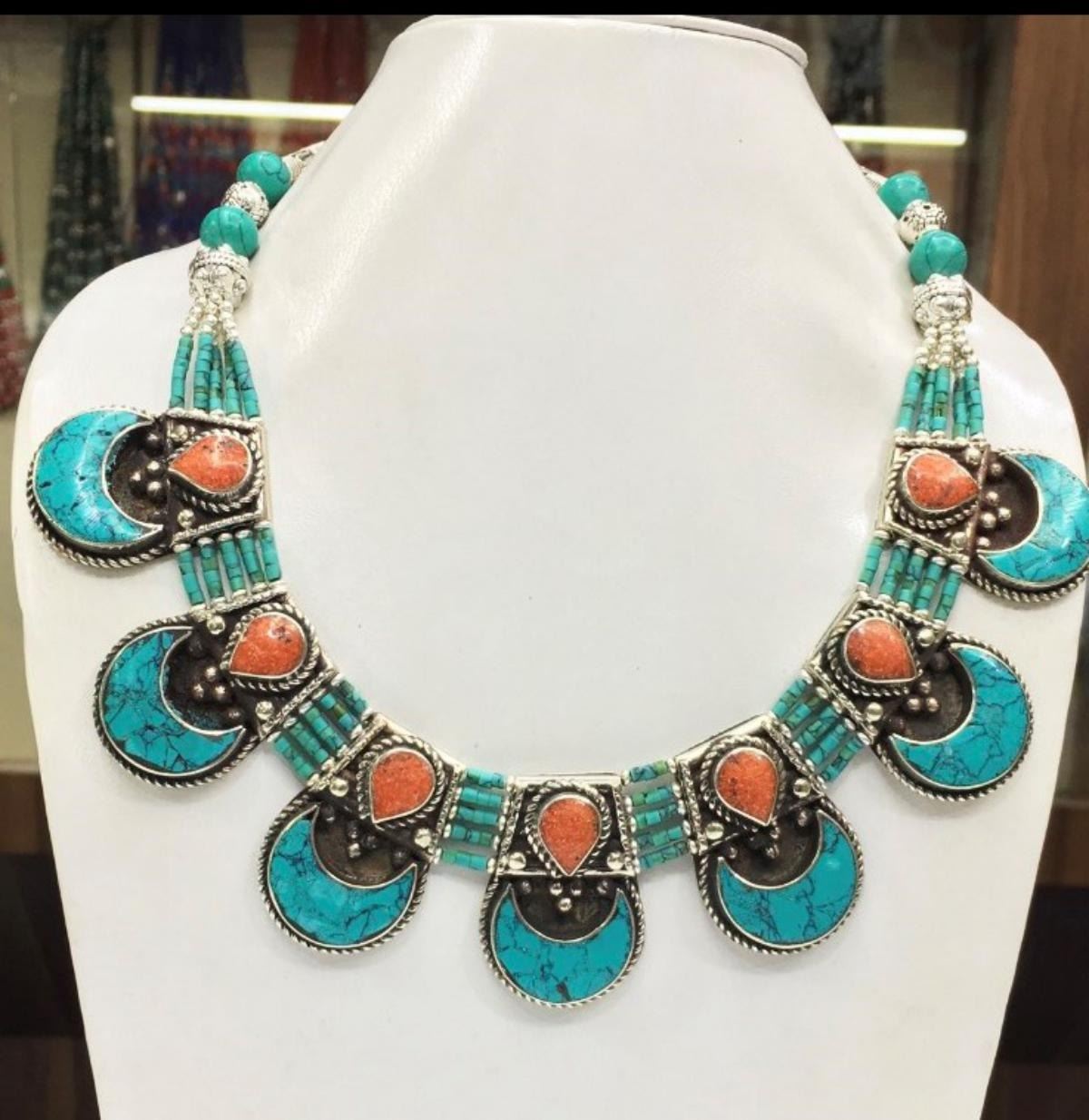 Tibet Natural Stone Hand Made Turquoise, Coral Necklace.......This elegant large Necklace was handcrafted in Tibet, the home of exquisite jewelry craftsmanship. It was skillfully made with large natural Turquoise, each in a deep Tibetan Silver setting. and balance the design perfectly. Turquoise is used virtually worldwide for jewelry making, and is highly prized for its brilliant colors, which vary from mine to mine. The distinctive webbing patterns and variations of color in the stones on this wonderful piece are typical of the natural Turquoise found throughout much of the Himalayan region, where Turquoise has been used in jewelry-making since centuries.”””Note- All stones in this necklace are Natural.....Guaranteed....Vintage look but necklace is brand new.